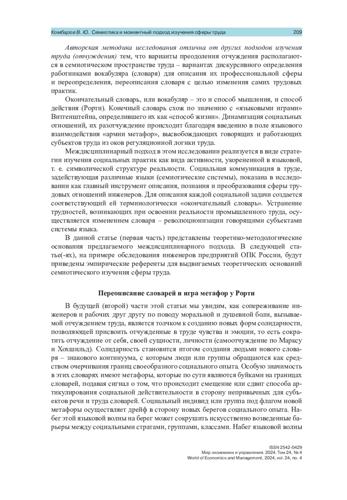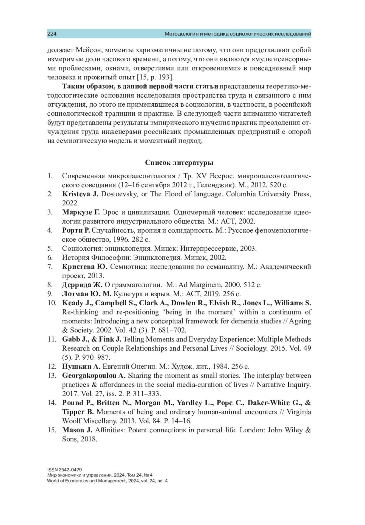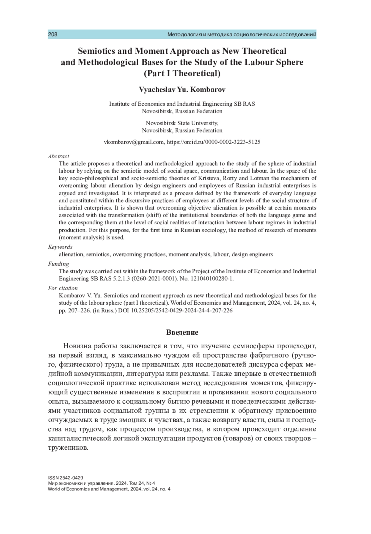 В статье предлагается теоретико-методологический подход для изучения сферы промышленного труда с опорой на семиотическую модель социального пространства, коммуникации и труда. В пространстве ключевых социально-философских и социо-семиотических теорий Кристевой, Рорти и Лотмана аргументирован и исследован механизм преодоления инженерами-конструкторами и сотрудниками российских промышленных предприятий отчуждения труда, получающий толкование как процесс, задаваемый рамками повседневного языка и конституирующийся внутри дискурсивных практик работников разных уровней социальной структуры промышленных предприятий. Показано, что преодоление объективного отчуждения возможно в определенные моменты, связанные с трансформацией (сдвигом) институциональных границ как языковой игры, так и соответствующих им на уровне социальных реалий взаимодействия трудовых режимов в промышленном производстве. Для этого также впервые в отечественной социологии применяется метод исследования моментов (moment analysis).
