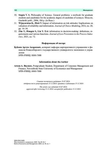 9. Zhu T., Haugen S., Liu Y. Risk information in decision-making: definitions, requirements and various functions // Journal of Loss Prevention in the Process Industries. 2021. № 72.