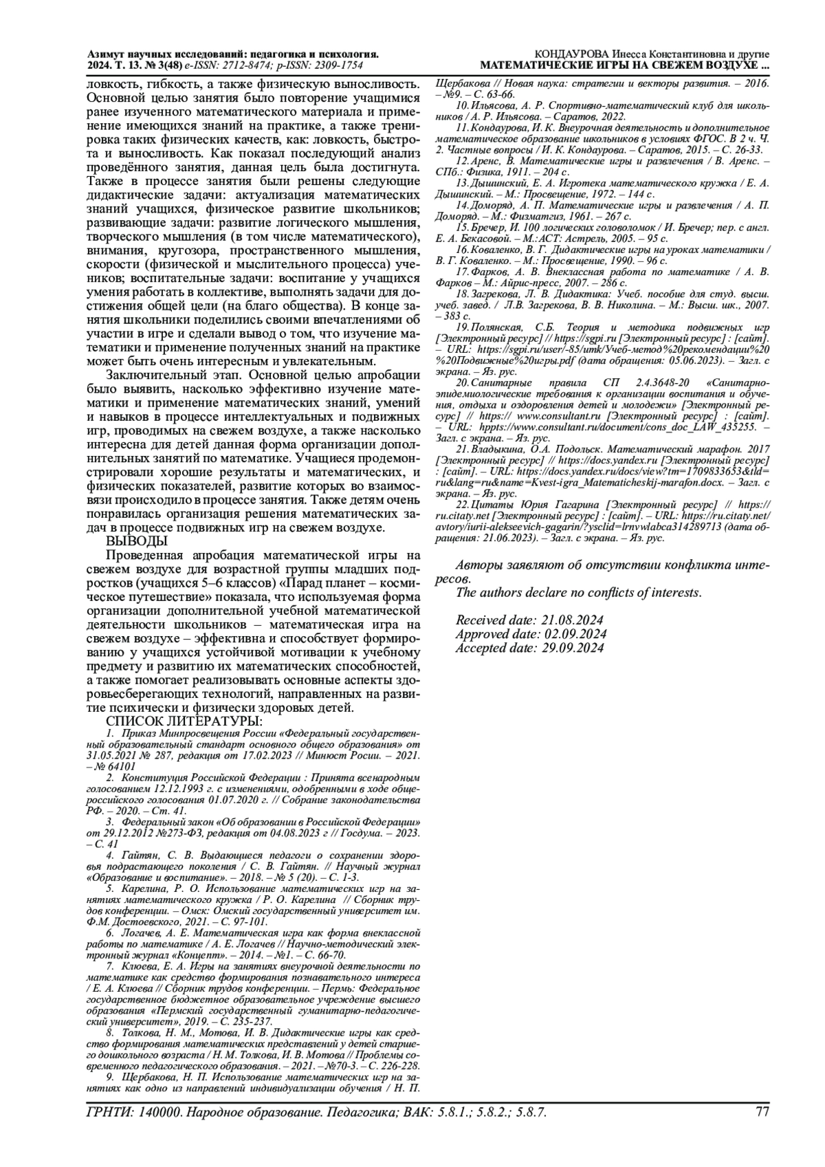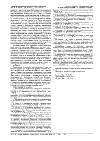 8. Толкова, Н. М., Мотова, И. В. Дидактические игры как средство формирования математических представлений у детей старшего дошкольного возраста / Н. М. Толкова, И. В. Мотова // Проблемы современного педагогического образования. - 2021. - №70-3. - С. 226-228. EDN: YGZVOQ