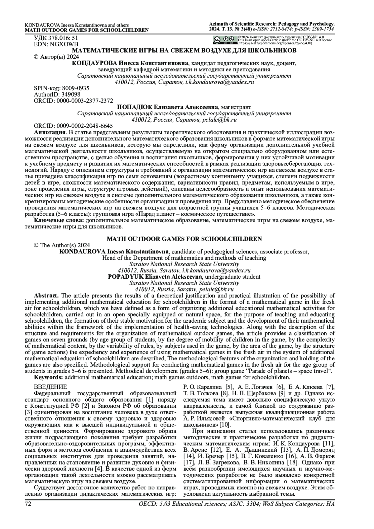 В статье представлены результаты теоретического обоснования и практической иллюстрации возможности реализации дополнительного математического образования школьников в формате математической игры на свежем воздухе для школьников, которую мы определили, как форму организации дополнительной учебной математической деятельности школьников, осуществляемую на открытом специально оборудованном или естественном пространстве, с целью обучения и воспитания школьников, формирования у них устойчивой мотивации к учебному предмету и развития их математических способностей в рамках реализации здоровьесберегающих технологий. Наряду с описанием структуры и требований к организации математических игр на свежем воздухе в статье приведена классификация игр по семи основаниям (возрастному контингенту учащихся, степени подвижности детей в игре, сложности математического содержания, вариативности правил, предметам, используемым в игре, зоне проведения игры, структуре игровых действий), описаны целесообразность и опыт использования математических игр на свежем воздухе в системе дополнительного математического образования школьников, а также конкретизированы методические особенности организации и проведения игр. Представлено методическое обеспечение проведения математических игр на свежем воздухе для возрастной группы учащихся 5-6 классов. Методическая разработка (5-6 классы): групповая игра «Парад планет - космическое путешествие».