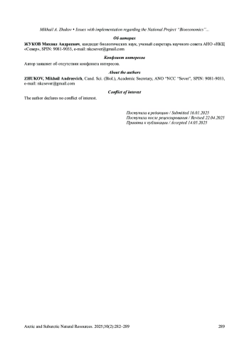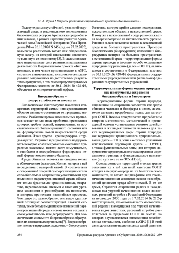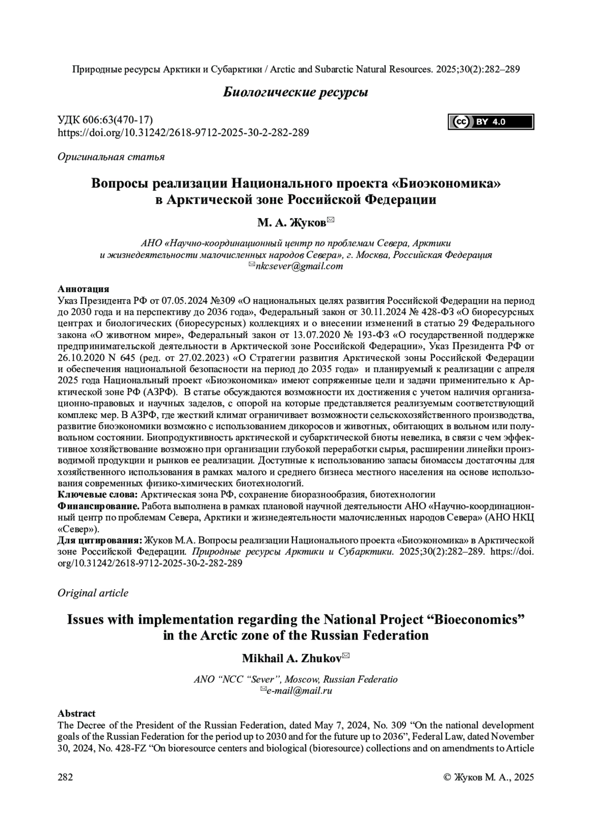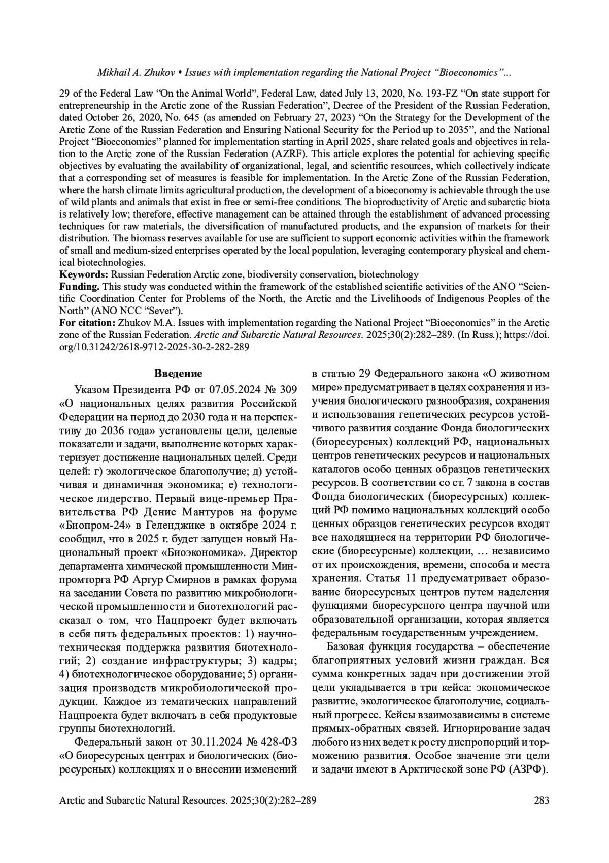 Указ Президента РФ от 07.05.2024 №309 «О национальных целях развития Российской Федерации на период до 2030 года и на перспективу до 2036 года», Федеральный закон от 30.11.2024 № 428-ФЗ «О биоресурсных центрах и биологических (биоресурсных) коллекциях и о внесении изменений в статью 29 Федерального закона «О животном мире», Федеральный закон от 13.07.2020 № 193-ФЗ «О государственной поддержке предпринимательской деятельности в Арктической зоне Российской Федерации», Указ Президента РФ от 26.10.2020 N 645 (ред. от 27.02.2023) «О Стратегии развития Арктической зоны Российской Федерации и обеспечения национальной безопасности на период до 2035 года» и планируемый к реализации с апреля 2025 года Национальный проект «Биоэкономика» имеют сопряженные цели и задачи применительно к Арктической зоне РФ (АЗРФ). В статье обсуждаются возможности их достижения с учетом наличия организационно-правовых и научных заделов, с опорой на которые представляется реализуемым соответствующий комплекс мер. В АЗРФ, где жесткий климат ограничивает возможности сельскохозяйственного производства, развитие биоэкономики возможно с использованием дикоросов и животных, обитающих в вольном или полувольном состоянии. Биопродуктивность арктической и субарктической биоты невелика, в связи с чем эффективное хозяйствование возможно при организации глубокой переработки сырья, расширении линейки производимой продукции и рынков ее реализации. Доступные к использованию запасы биомассы достаточны для хозяйственного использования в рамках малого и среднего бизнеса местного населения на основе использования современных физико-химических биотехнологий.