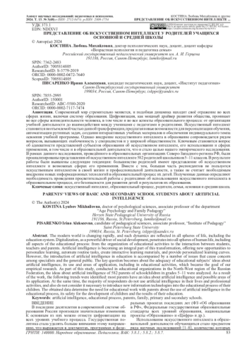 Современный мир стремительно меняется, и подобная динамика находит своё отражение во всех сферах жизни, включая систему образования. Цифровизация, как мощный драйвер развития общества, проникает во все сферы жизнедеятельности человека, в том числе и во все аспекты образовательного процесса: от организации учебной деятельности до взаимодействия между учениками с педагогами и родителями. Искусственный интеллект становится неотъемлемой частью данной трансформации, предлагая новые возможности для персонализации обучения, автоматизации рутинных задач, создания интерактивных учебных материалов и обеспечения индивидуального темпа освоения учебной программы. Однако внедрение искусственного интеллекта в образование сопровождается рядом вопросов, вызывающих озабоченность у специалистов и у широкой общественности. Ключевым становится вопрос об адекватности представлений субъектов образования об искусственном интеллекте, его использовании и сферах применения, в том числе и в образовательной деятельности, что и стало целью нашего эмпирического исследования. В рамках данного исследования, проведённого в образовательных организациях Северо-Западного региона РФ, были проанализированы представления об искусственном интеллекте 582 родителей школьников 5-11 классов. В результате работы были выявлены следующие тенденции: большинство родителей имеют представление об искусственном интеллекте и возможных сферах его применения. Вместе с тем, большая часть респондентов не пользуется искусственным интеллектом в своей жизни и профессиональной деятельности, а также не считает необходимым внедрение новых информационных технологий в образовательный процесс их детей. Полученные данные определяют необходимость проведения просветительской работы с родителями об использовании искусственного интеллекта в образовательном процессе, его безопасности для развития детей и результатов их образования.
