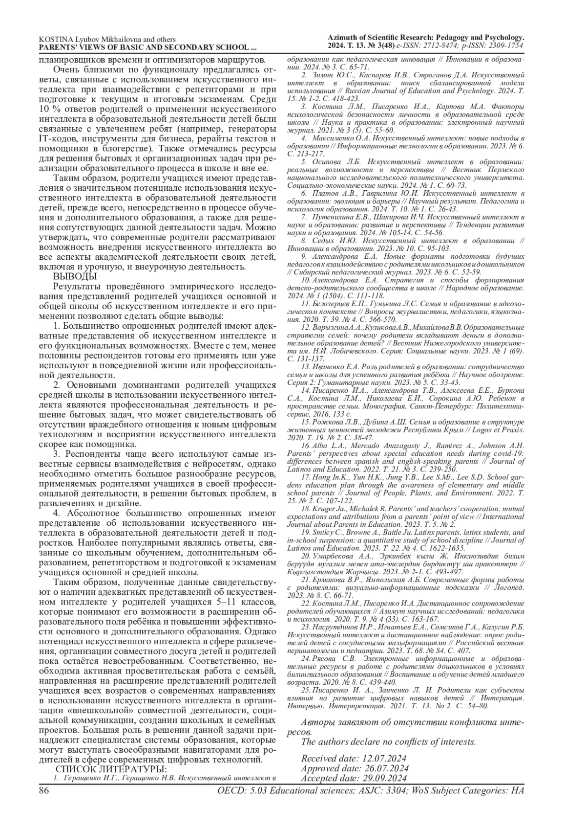 13. Иваненко Е.А. Роль родителей в образовании: сотрудничество семьи и школы для успешного развития ребёнка // Научное обозрение. Серия 2: Гуманитарные науки. 2023. № 5. С. 33-43. EDN: MVUOXY