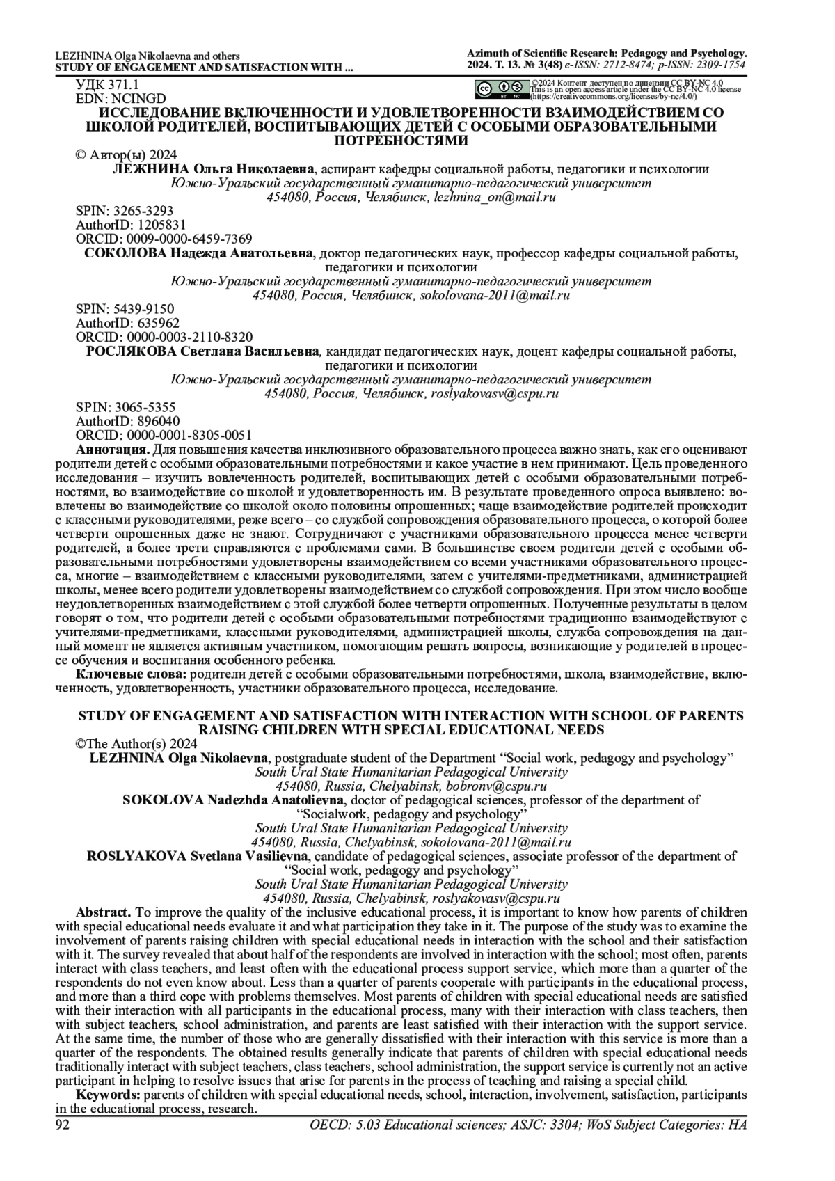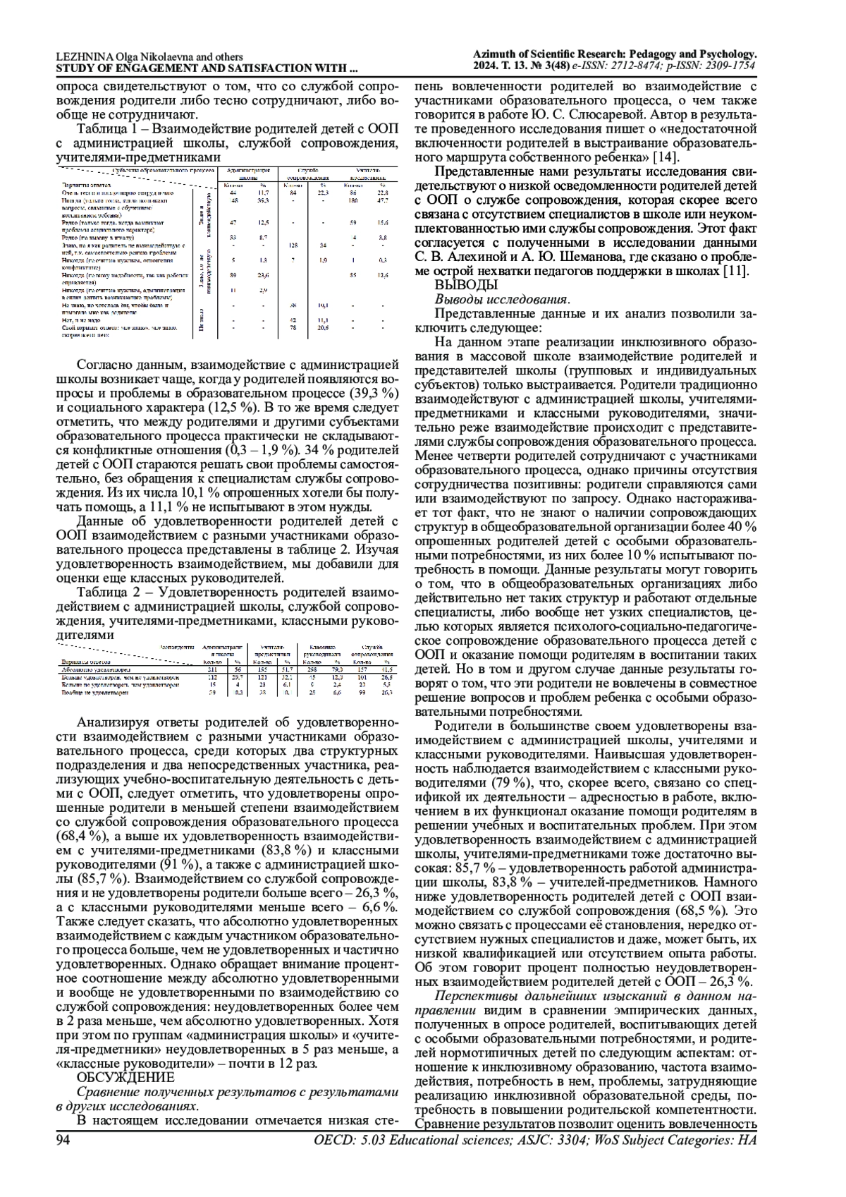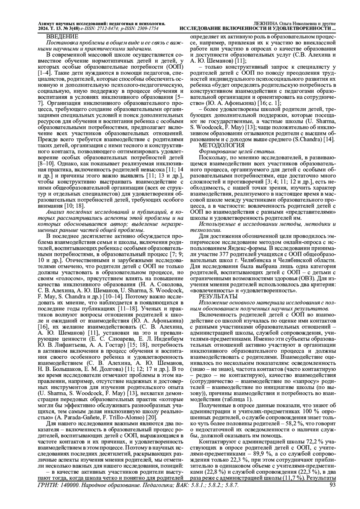 11. Алехина С. В., Шеманов А. Ю. Оценка родителями инклюзивной образовательной среды школы и своего участия в ее создании // Клиническая и специальная психология. 2023. Т. 12, № 3. С. 213-233. EDN: AHPSJK