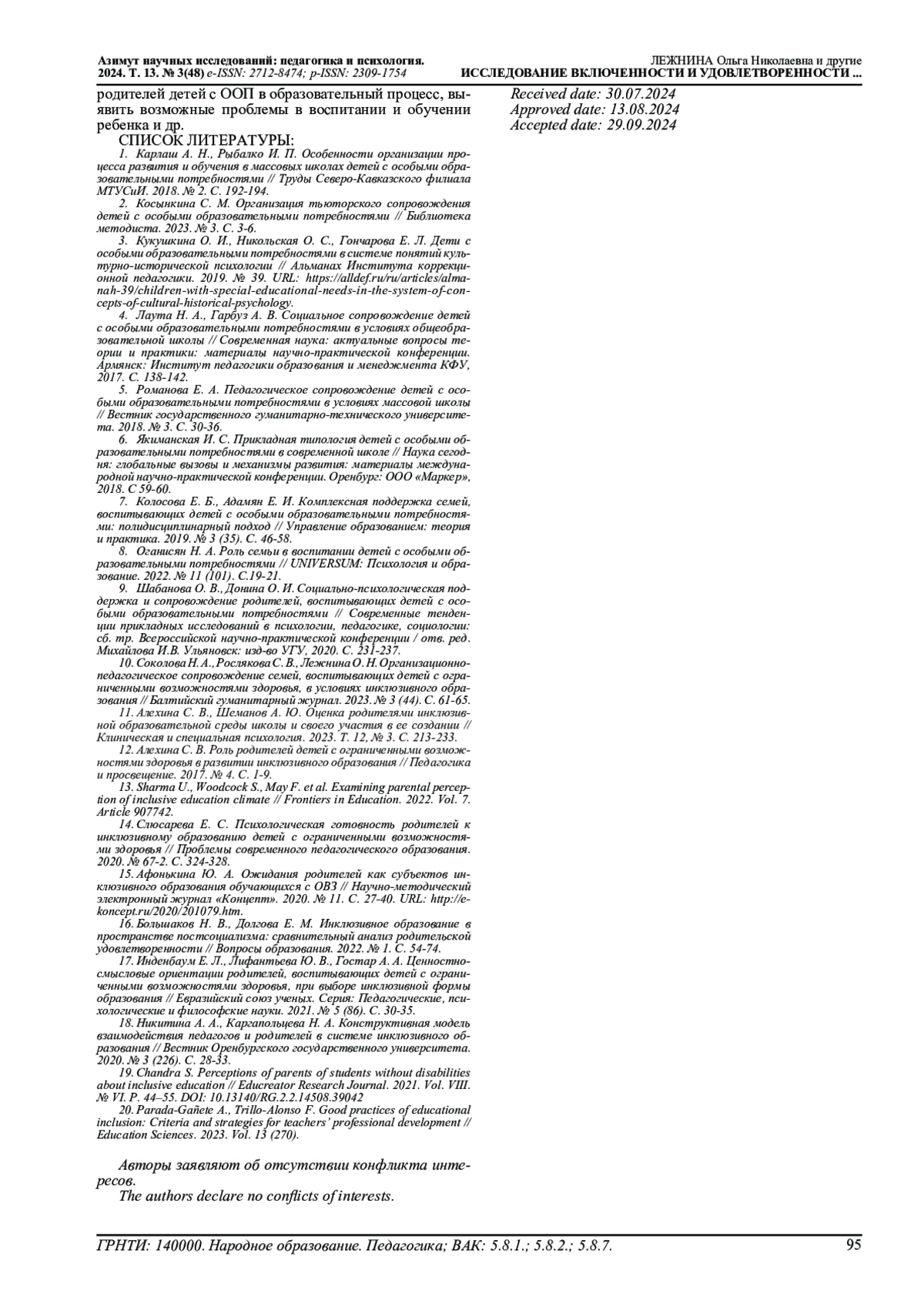 13. Sharma U., Woodcock S., May F. et al. Examining parental perception of inclusive education climate // Frontiers in Education. 2022. Vol. 7. Article 907742. EDN: QPXXCR