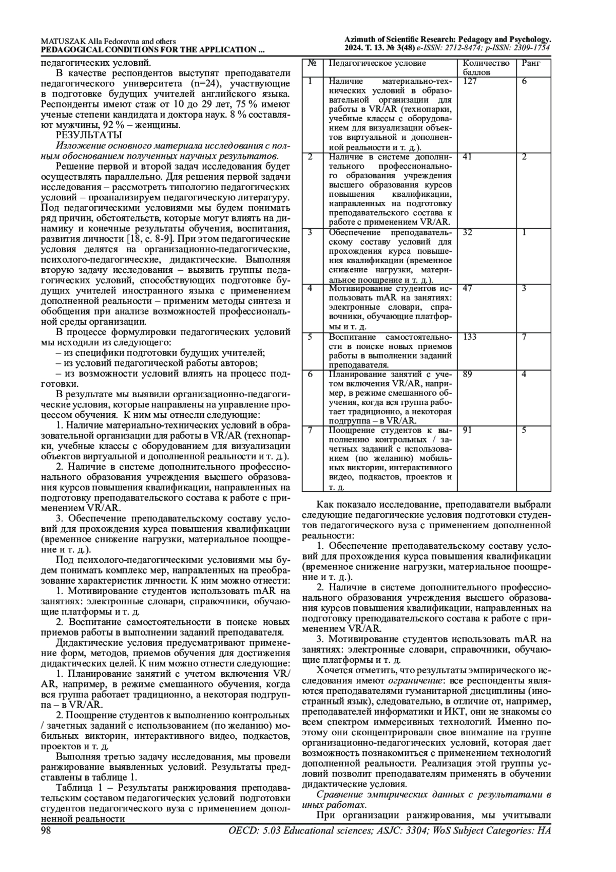 В статье рассматривается вопрос разработки педагогических условий подготовки студентов педагогического вуза с применением дополненной реальности. Применены методы анализа для конкретизации типологии педагогических условий, синтеза и обобщения для разработки комплекса педагогических условий, а также метод ранжирования для выявления мнения преподавателей об эффективности педагогических условий. В качестве респондентов выступают преподаватели педагогического университета. Педагогические условия разделены на организационно-педагогические, психолого-педагогические, дидактические. К организационно-педагогическим условиям мы относим наличие в системе дополнительного профессионального образования учреждения высшего образования курсов повышения квалификации, направленных на подготовку преподавательского состава к работе с применением VR/AR; наличие материально-технических условий в образовательной организации для работы в VR/AR; обеспечение преподавательскому составу условий для прохождения курса повышения квалификации. В группу психолого-педагогических входят следующие: мотивирование студентов использовать mAR на занятиях; воспитание самостоятельности в поиске новых приемов работы в выполнении заданий преподавателя. К дидактическим отнесено планирование занятий с учетом включения VR/AR в режиме смешанного обучения; поощрение студентов к выполнению зачетных заданий с использованием мобильных викторин, интерактивного видео, подкастов, проектов и т. д. В качестве эффективных преподаватели выбрали организационно-педагогические и психолого-педагогические условия.