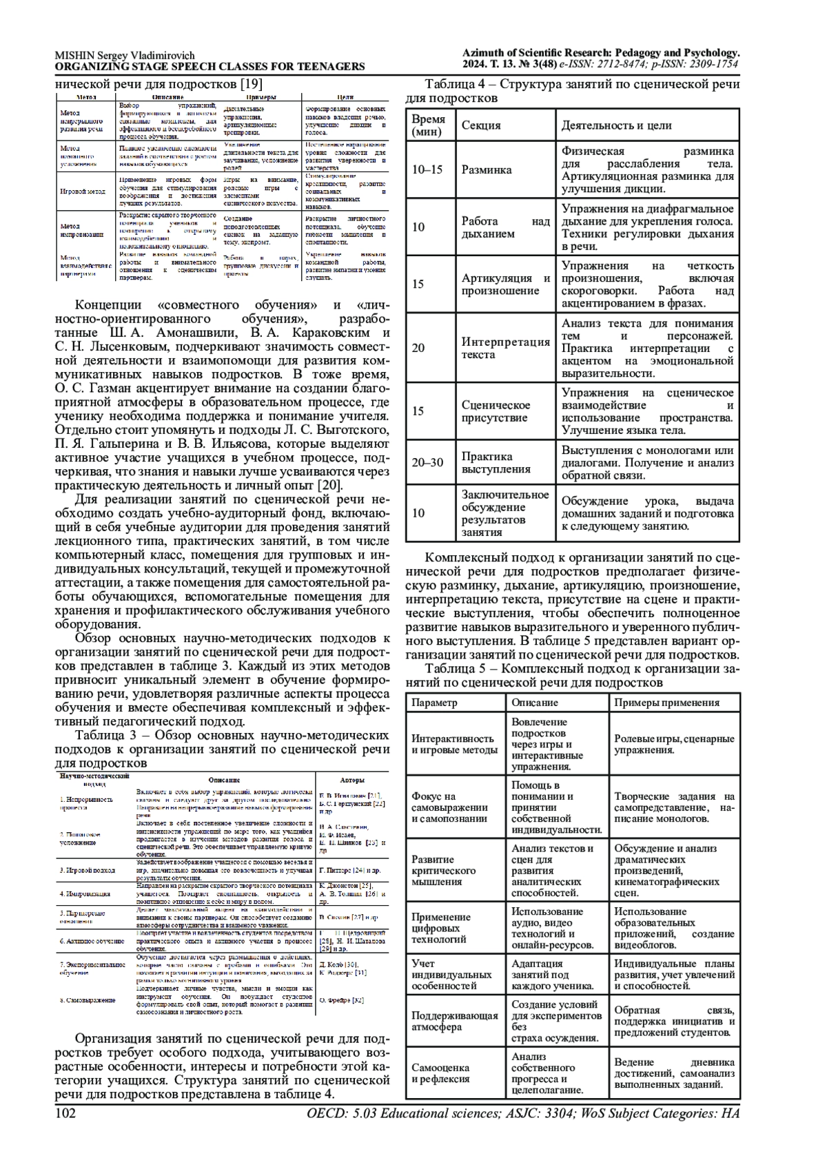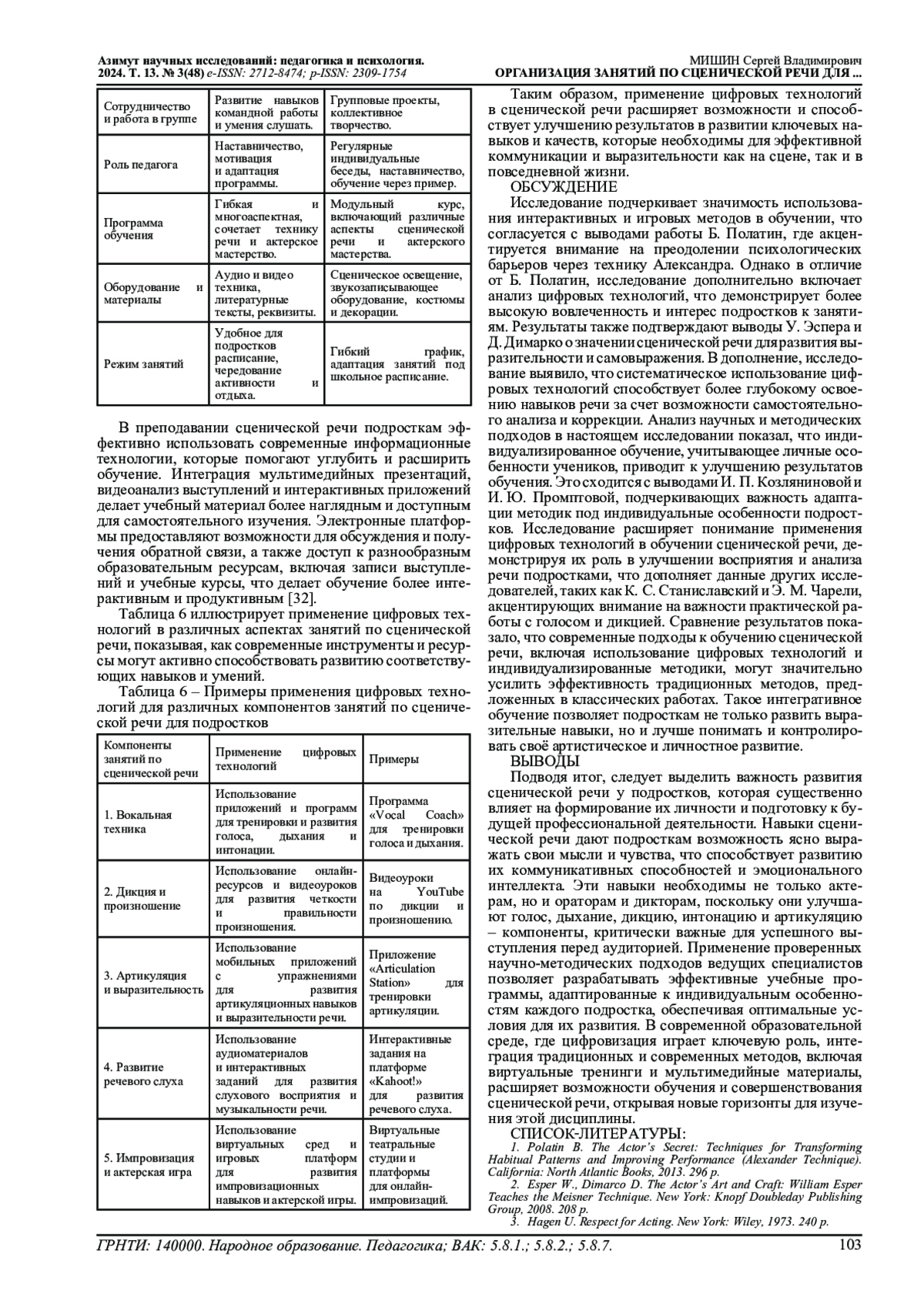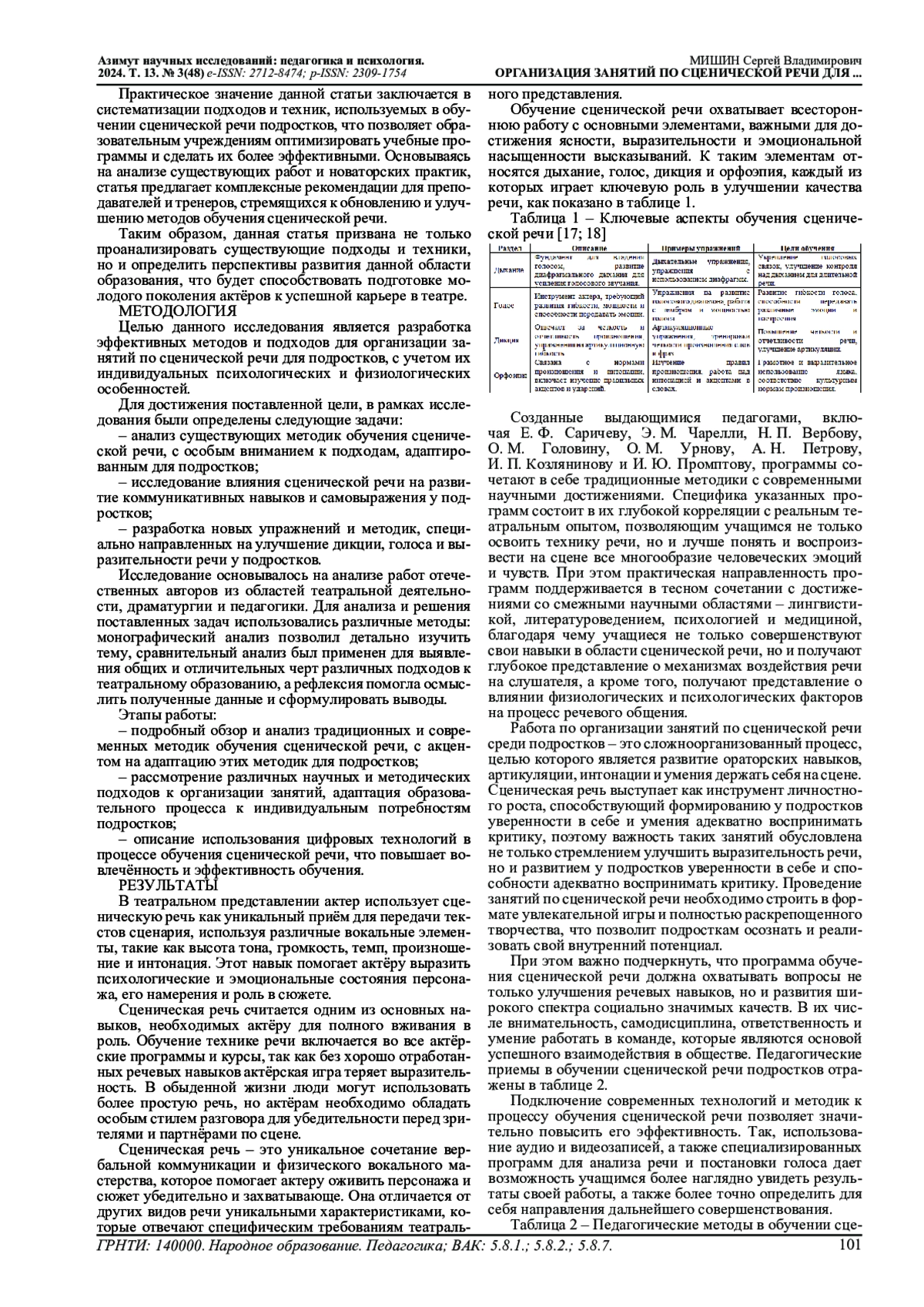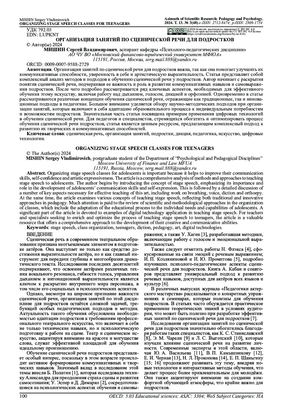 Организация занятий по сценической речи для подростков важна, так как она помогает улучшить их коммуникативные способности, уверенность в себе и артистическую выразительность. Статья представляет собой комплексный анализ методов и подходов к обучению сценической речи у подростков. Автор начинает с раскрытия понятия сценической речи, подчеркивая ее важность и роль в развитии коммуникативных навыков и самовыражения подростков. После чего подробно рассматривается ряд ключевых аспектов, необходимых для эффективного обучения этому искусству, включая работу над дыханием, голосом, дикцией и орфоэпией. Одновременно в статье рассматриваются различные концепции обучения сценической речи, отражающие как традиционные, так и инновационные подходы в педагогике. Большое внимание уделяется обзору научно-методических подходов при организации занятий, которые включают в себя адаптацию образовательного процесса к индивидуальным потребностям и возможностям подростков. Значительная часть статьи посвящена примерам применения цифровых технологий в обучении сценической речи. Для педагогов и специалистов, стремящихся обогатить и оптимизировать процесс обучения сценической речи подростков, статья является ценным ресурсом, предлагающим комплексный подход к развитию их творческих и коммуникативных способностей.