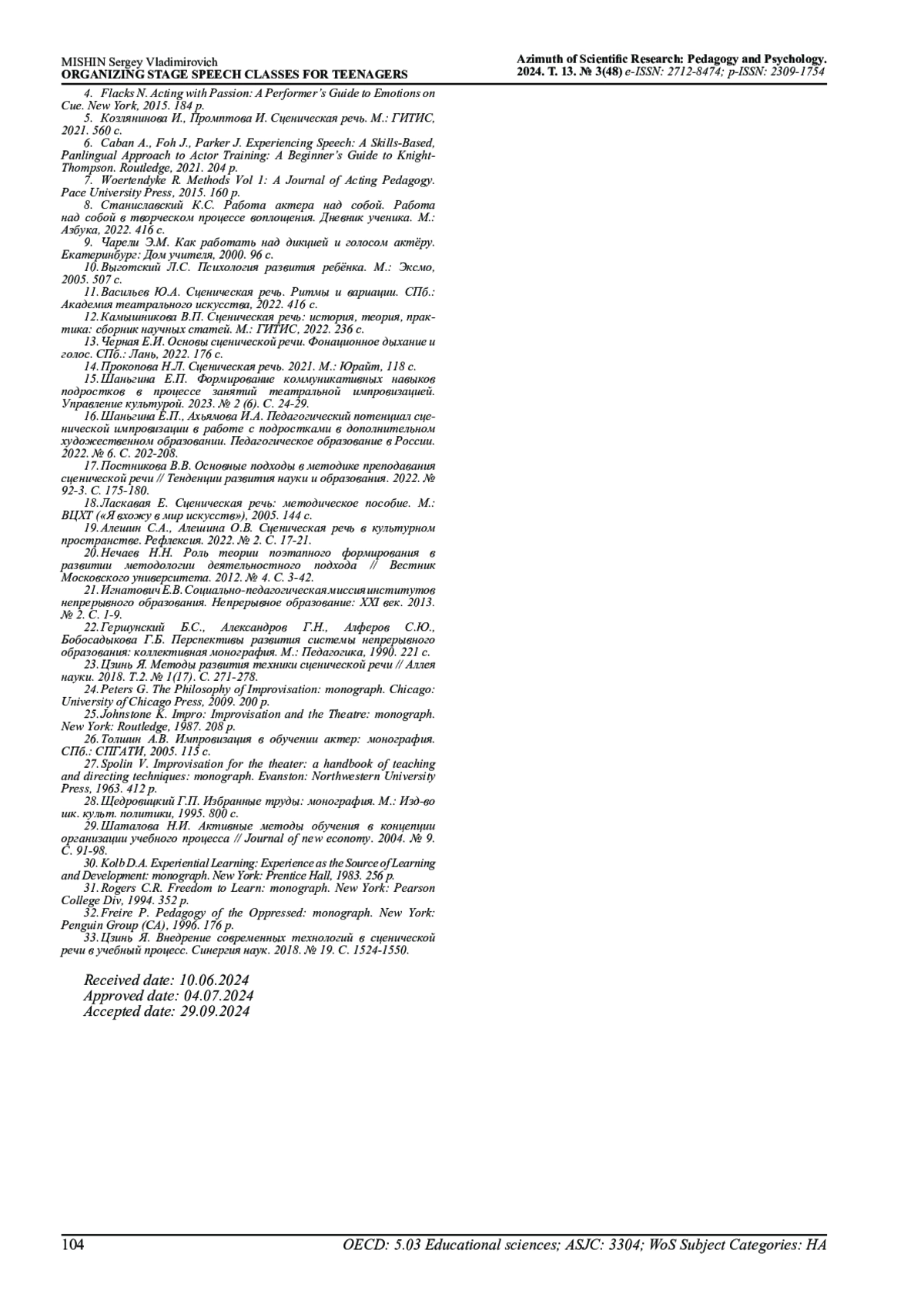 16. Шаньгина Е.П., Ахьямова И.А. Педагогический потенциал сценической импровизации в работе с подростками в дополнительном художественном образовании. Педагогическое образование в России. 2022. № 6. С. 202-208. EDN: POEXUR