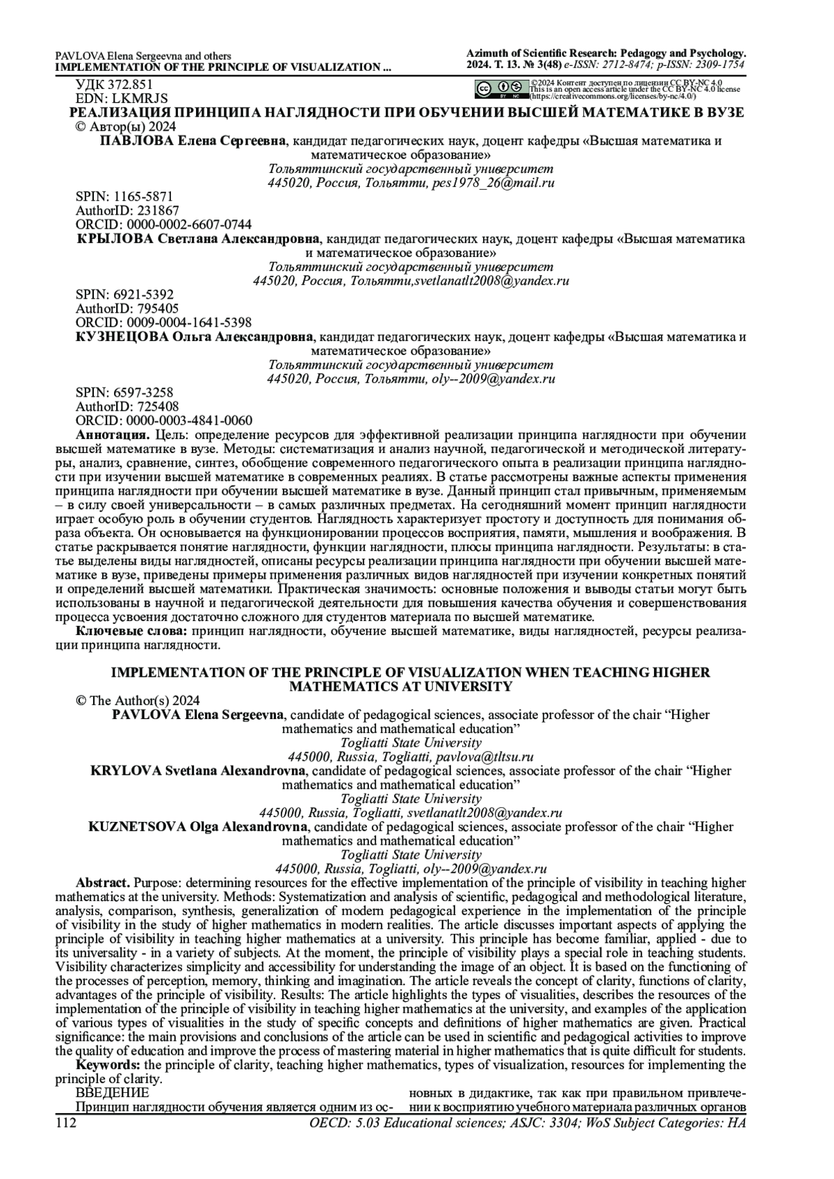 8. Долгов А. В., Дударева Н. В. Обзор средств реализации принципа наглядности при обучении высшей математике // В сборнике: Актуальные вопросы преподавания математики, информатики и информационных технологий. Межвузовский сборник научных работ. Научный редактор Л. В. Сардак. Екатеринбург, 2022. С. 255-259. EDN: UMQTBA
