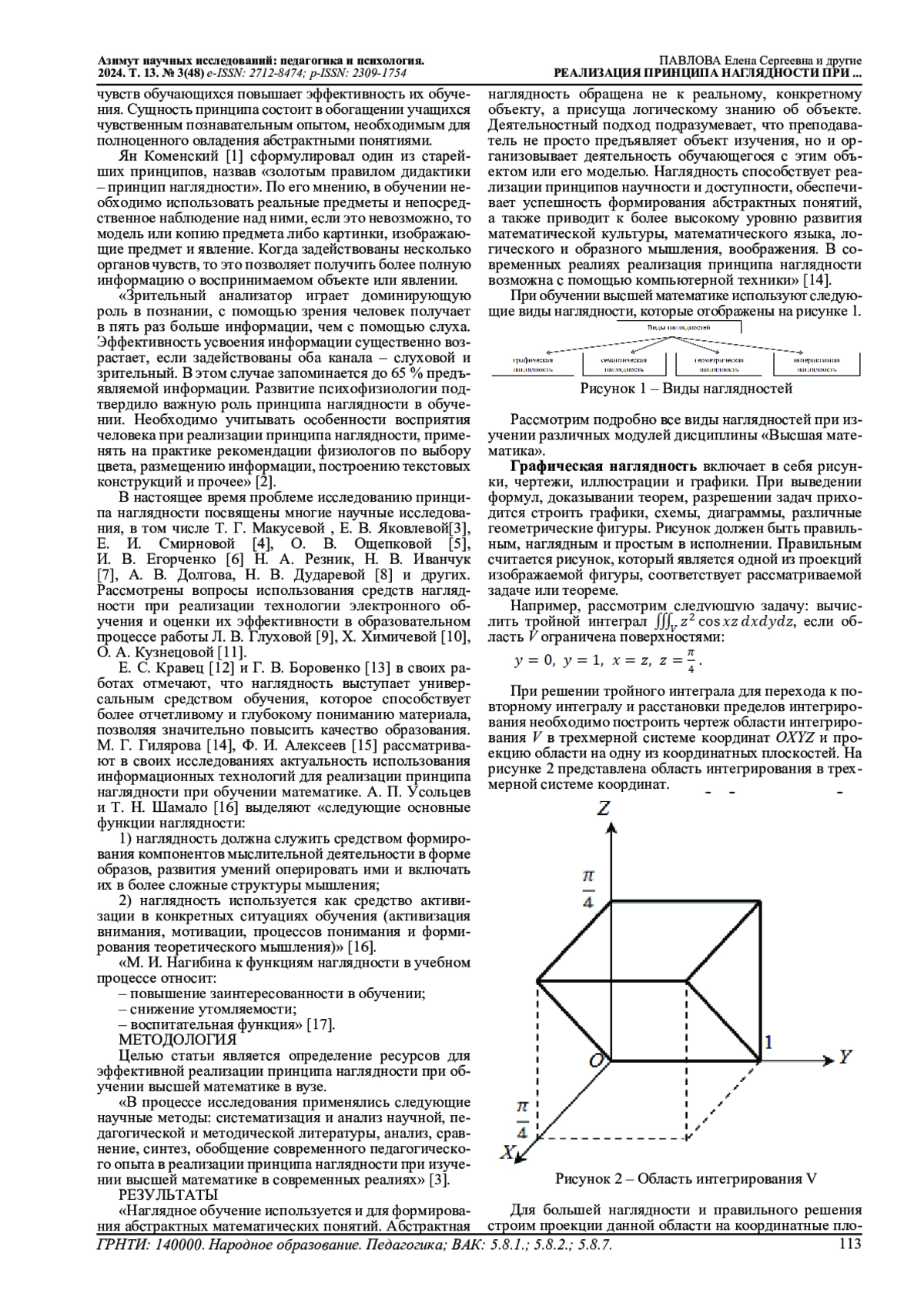 Методы: систематизация и анализ научной, педагогической и методической литературы, анализ, сравнение, синтез, обобщение современного педагогического опыта в реализации принципа наглядности при изучении высшей математике в современных реалиях. В статье рассмотрены важные аспекты применения принципа наглядности при обучении высшей математике в вузе. Данный принцип стал привычным, применяемым - в силу своей универсальности - в самых различных предметах. На сегодняшний момент принцип наглядности играет особую роль в обучении студентов. Наглядность характеризует простоту и доступность для понимания образа объекта. Он основывается на функционировании процессов восприятия, памяти, мышления и воображения. В статье раскрывается понятие наглядности, функции наглядности, плюсы принципа наглядности.