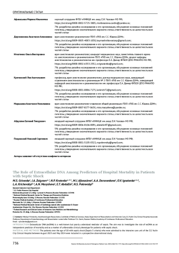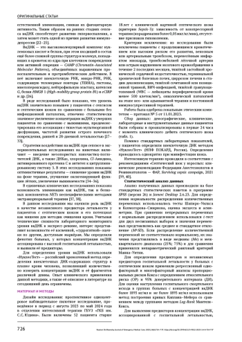 14. Писарев В.М., Чумаченко А.Г., Филев А.Д., Ершова Е.С., Костюк С.В., Вейко Н.Н. и др. Комбинация молекулярных биомаркеров ДНК в прогнозе исхода критических состояний. Общая реаниматология. 2019;15(3):31-47.
