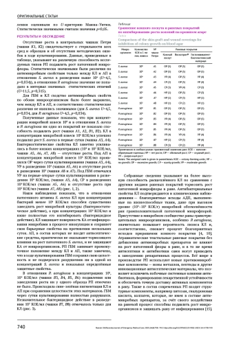 В работе использовали расщеплённый КЛ и два типа РП: на основе гиалуроновой кислоты (ГБМ) и атравматическое РП Воскопран® (АП). Антимикробные свойства оценивали к госпитальному мецитилин-резистентному штамму S. aureus и фторхинолон-резистентному штамму P. aeruginosa. Проведены 2 серии по 8 опытов на чашках с кровяным агаром (КА) в разведении микробных тел 102, 104, 106, 108 КОЕ/мл.