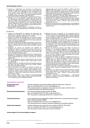 2. Каштанов А.Д., Васильев Ю.Л., Байрашевская А.В. Обзор современных материалов, применяемых для покрытия раневых поверхностей. Оперативная хирургия и клиническая анатомия (Пироговский научный журнал). 2020;4(2):49-56. https://doi.org/operhirurg2020402149.