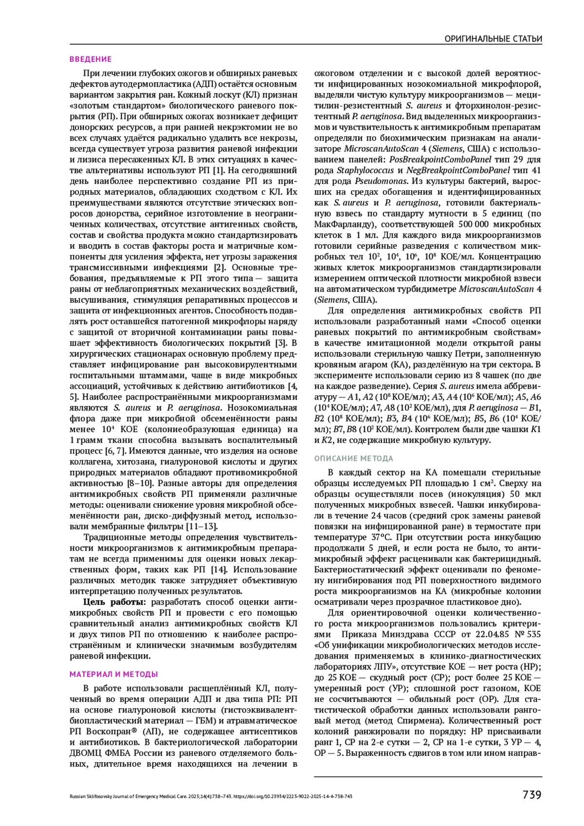 При лечении глубоких ожогов и обширных раневых дефектов аутодермопластика (АДП) остаётся основным вариантом закрытия ран. Кожный лоскут (КЛ) признан «золотым стандартом» биологического раневого покрытия (РП). При обширных ожогах возникает дефицит донорских ресурсов, а при ранней некрэктомии не во всех случаях удаётся радикально удалить все некрозы, всегда существует угроза развития раневой инфекции и лизиса пересаженных КЛ. В этих ситуациях в качестве альтернативы используют РП [1]. На сегодняшний день наиболее перспективно создание РП из природных материалов, обладающих сходством с КЛ. Их преимуществами являются отсутствие этических вопросов донорства, серийное изготовление в неограниченных количествах, отсутствие антигенных свойств, состав и свойства продукта можно стандартизировать и вводить в состав факторы роста и матричные компоненты для усиления эффекта, нет угрозы заражения трансмиссивными инфекциями [2]. Основные требования, предъявляемые к РП этого типа — защита раны от неблагоприятных механических воздействий, высушивания, стимуляция репаративных процессов и защита от инфекционных агентов. Способность подавлять рост оставшейся патогенной микрофлоры наряду с защитой от вторичной контаминации раны повышает эффективность биологических покрытий [3]. В хирургических стационарах основную проблему представляет инфицирование ран высоковирулентными госпитальными штаммами, чаще в виде микробных ассоциаций, устойчивых к действию антибиотиков [4, 5]. Наиболее распространёнными микроорганизмами являются S. aureus и P. aeruginosa. Нозокомиальная флора даже при микробной обсеменённости раны менее 104 КОЕ (колониеобразующая единица) на 1 грамм ткани способна вызывать воспалительный процесс [6, 7]. Имеются данные, что изделия на основе коллагена, хитозана, гиалуроновой кислоты и других природных материалов обладают противомикробной активностью [8–10]. Разные авторы для определения антимикробных свойств РП применяли различные методы: оценивали снижение уровня микробной обсеменённости ран, диско-диффузный метод, использовали мембранные фильтры [11–13].
