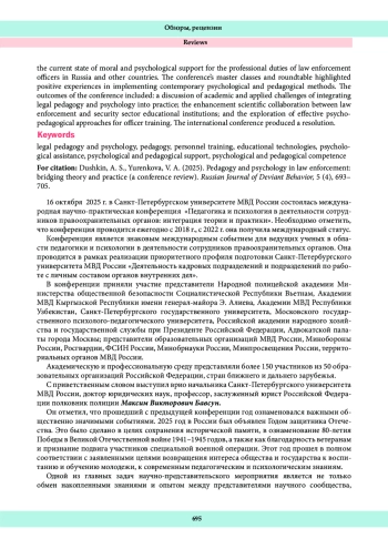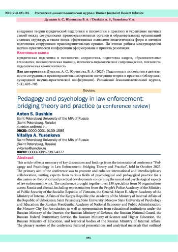 В статье представлен обзор международной научно-практической конференции «Педагогика и психология в деятельности сотрудников правоохранительных органов: интеграция теории и практики», прошедшей в октябре 2025 г. Конференция преследовала цель расширения и укрепления научного международного и межведомственного сотрудничества, объединения специалистов, работающих в различных сферах психолого-педагогической практики, обсуждения теоретических и практических разработок в области морально-психологической деятельности сотрудников правоохранительных органов. В конференции приняли участие более 150 специалистов из 50 организаций России и зарубежья, среди которых: представители Народной полицейской академии Министерства общественной безопасности Социалистической Республики Вьетнам, Академии МВД Кыргызской Республики имени генерал-майора Э. Алиева, Академии МВД Республики Узбекистан, Санкт-Петербургского государственного университета, Московского государственного психолого-педагогического университета, Российской академии народного хозяйства и государственной службы при Президенте Российской Федерации, Адвокатской палаты города Москвы; представители образовательных организаций МВД России, Минобороны России, Росгвардии, ФСИН России, Минобрнауки России, Минпросвещения России, территориальных органов МВД России. На пленарном заседании конференции были представлены доклады и аналитические материалы, характеризующие современное состояние морально-психологического обеспечения служебной деятельности сотрудников правоохранительных органов России и зарубежных государств. В мастер-классах и на круглом столе представлен положительный опыт реализации современных психолого-педагогических практик. Результатом конференции стало обсуждение академических и прикладных проблем внедрения теории юридической педагогики и психологии в практику и укрепление научных связей между сотрудниками правоохранительных органов и образовательных организаций силовых структур, а также поиск эффективных психолого-педагогических форм и методов подготовки сотрудников правоохранительных органов. По итогам работы международной научно-практической конференции сформирована и принята резолюция.