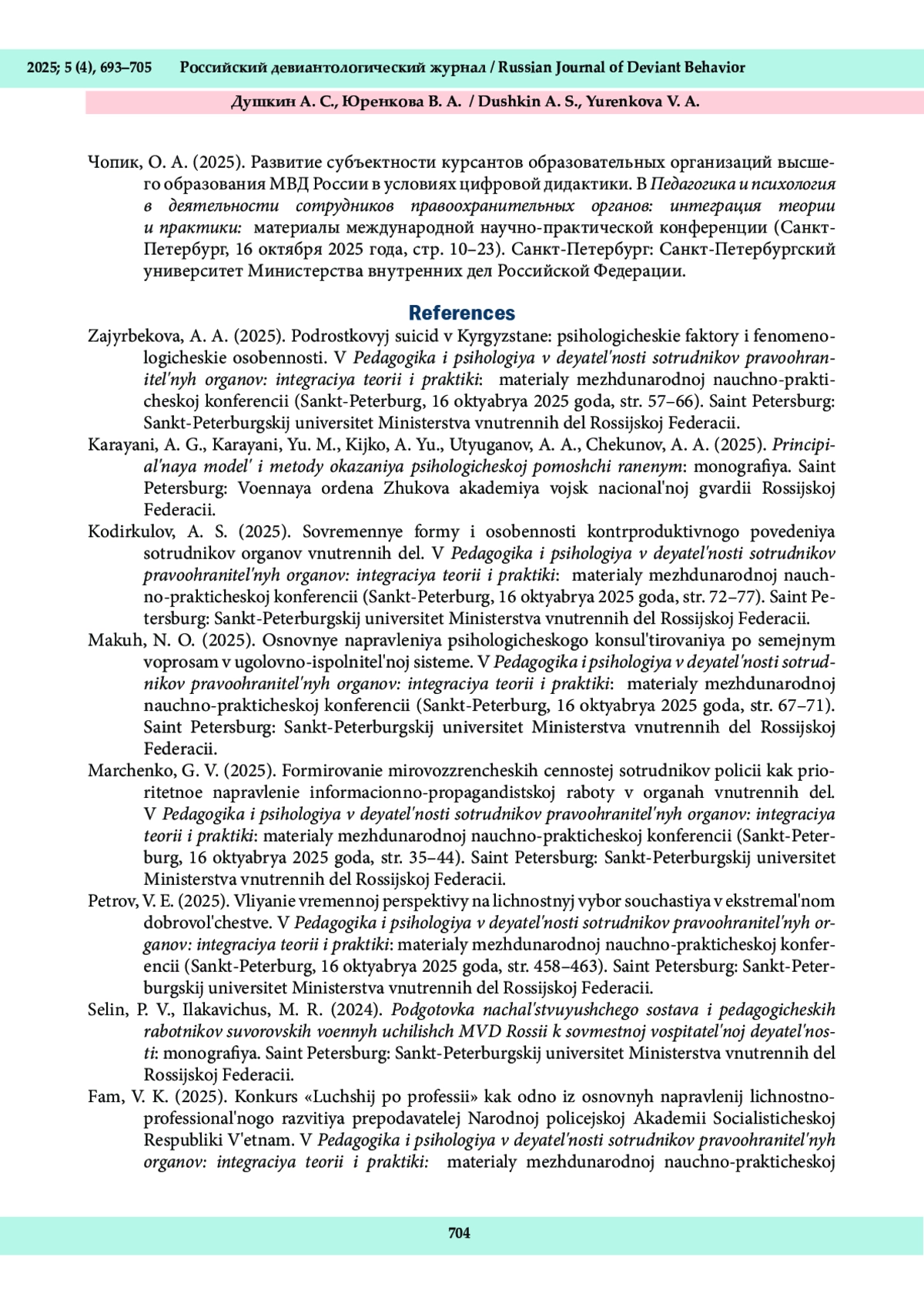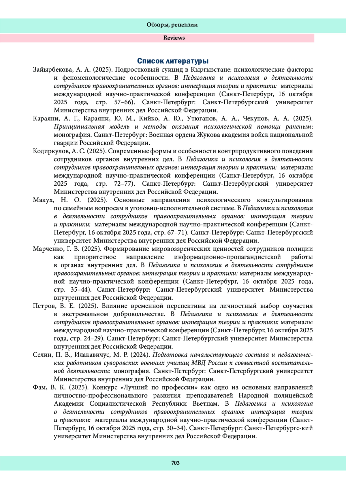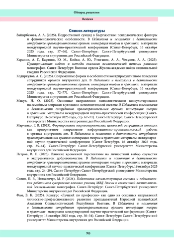 3. Кодиркулов, А. С. (2025). Современные формы и особенности контрпродуктивного поведения сотрудников органов внутренних дел. В Педагогика и психология в деятельности сотрудников правоохранительных органов: интеграция теории и практики: материалы международной научно-практической конференции (Санкт-Петербург, 16 октября 2025 года, стр. 72-77). Санкт-Петербург: Санкт-Петербургский университет Министерства внутренних дел Российской Федерации.