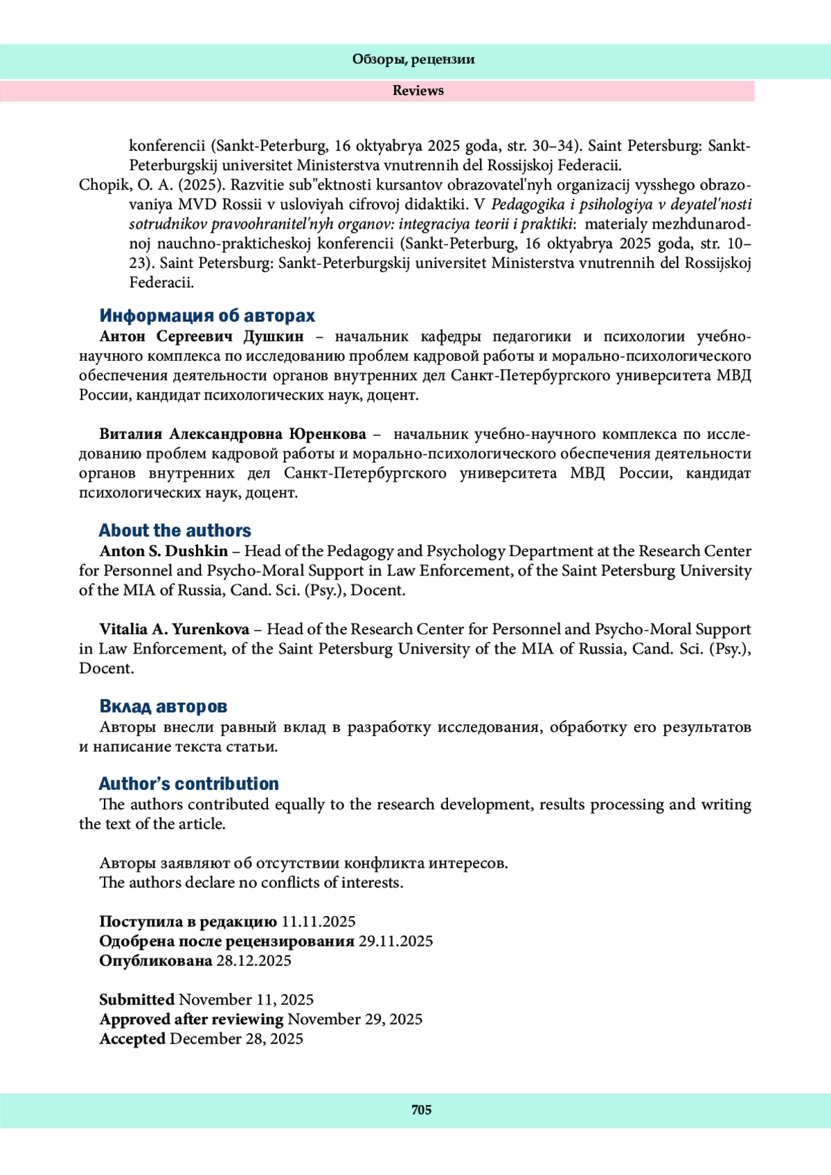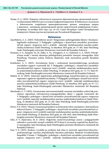 9. Чопик, О. А. (2025). Развитие субъектности курсантов образовательных организаций высшего образования МВД России в условиях цифровой дидактики. В Педагогика и психология в деятельности сотрудников правоохранительных органов: интеграция теории и практики: материалы международной научно-практической конференции (Санкт-Петербург, 16 октября 2025 года, стр. 10-23). Санкт-Петербург: Санкт-Петербургский университет Министерства внутренних дел Российской Федерации.