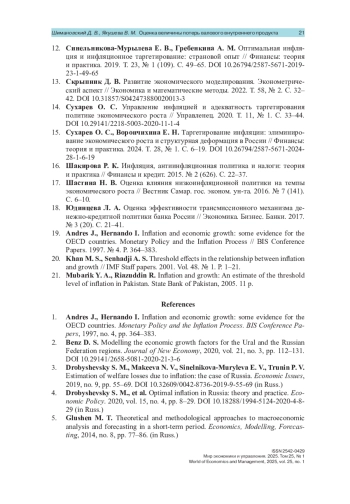 6. Дробышевский С. М. и др. Оптимальная инфляция в России: теория и практика // Экономическая политика. 2020. Т. 15. № 4. С. 8-29. https://doi.org/10.18288/19945124-2020-4-8-29