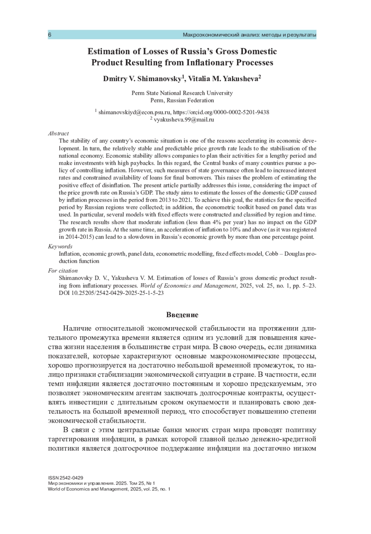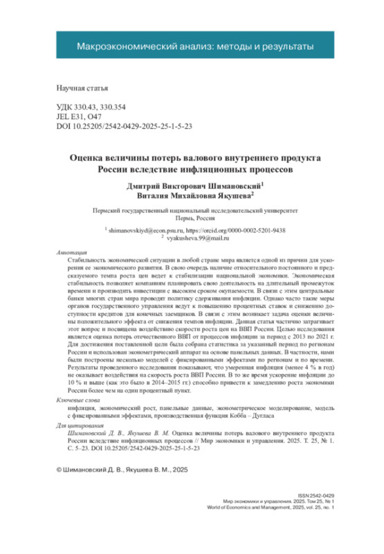 Стабильность экономической ситуации в любой стране мира является одной из причин для ускорения ее экономического развития. В свою очередь наличие относительного постоянного и предсказуемого темпа роста цен ведет к стабилизации национальной экономики. Экономическая стабильность позволяет компаниям планировать свою деятельность на длительный промежуток времени и производить инвестиции с высоким сроком окупаемости. В связи с этим центральные банки многих стран мира проводят политику сдерживания инфляции. Однако часто такие меры органов государственного управления ведут к повышению процентных ставок и снижению доступности кредитов для конечных заемщиков. В связи с этим возникает задача оценки величины положительного эффекта от снижения темпов инфляции. Данная статья частично затрагивает этот вопрос и посвящена воздействию скорости роста цен на ВВП России. Целью исследования является оценка потерь отечественного ВВП от процессов инфляции за период с 2013 по 2021 г. Для достижения поставленной цели была собрана статистика за указанный период по регионам России и использован эконометрический аппарат на основе панельных данных. В частности, нами были построены несколько моделей с фиксированными эффектами по регионам и по времени. Результаты проведенного исследования показывают, что умеренная инфляция (менее 4 % в год) не оказывает воздействия на скорость роста ВВП России. В то же время ускорение инфляции до 10 % и выше (как это было в 2014–2015 гг.) способно привести к замедлению роста экономики России более чем на один процентный пункт.