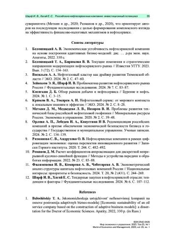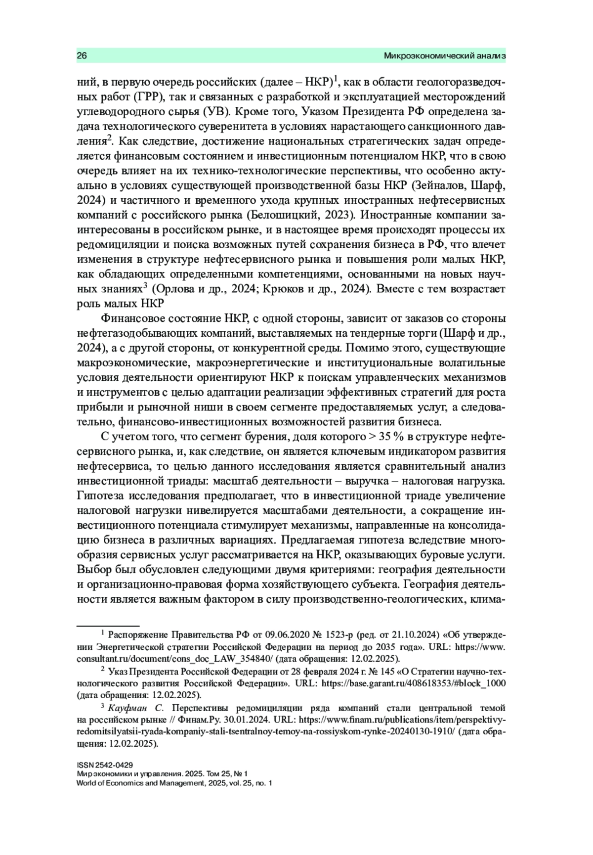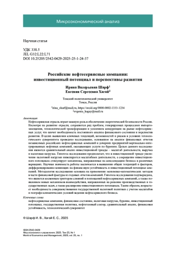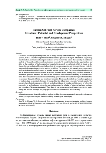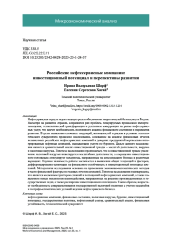 Нефтесервисная отрасль играет важную роль в обеспечении энергетической безопасности России. Несмотря на развитие отрасли, сохраняется ряд проблем, генерируемых процессами импортозамещения, технологической трансформации и усилением конкуренции на рынке нефтесервисных услуг, что влечет необходимость постоянного анализа финансового состояния и перспектив развития. В целях выявления ключевых тенденций, возможностей и рисков в условиях технологического суверенитета проведено исследование, основанное на анализе финансовых отчетов независимых российских нефтесервисных компаний и дочерних предприятий вертикально интегрированных нефтяных компаний, оказывающих услуги по бурению. Целью данного исследования является сравнительный анализ инвестиционной триады – масштаб деятельности, выручка и налоговая нагрузка. Гипотеза исследования предполагает, что в инвестиционной триаде увеличение налоговой нагрузки нивелируется масштабами деятельности, а сокращение инвестиционного потенциала стимулирует механизмы, направленные на консолидацию бизнеса в различных вариациях. Научная значимость работы заключается в выявлении общих тенденций и факторов, дифференцированно влияющих на финансовую устойчивость и инвестиционный потенциал компаний. Методология исследования основана на применении экономико-математических методов в части финансовой фактуры из годовых отчетов компаний. Гипотеза исследования подтверждена, что является косвенным триггером слияний и поглощений нефтесервисных компаний, а также появлением новых механизмов взаимодействия, направленных на решение производственных и государственных задач, а также расширение инвестиционного потенциала. Таким образом, возрастает необходимость совершенствования государственной налоговой политики с учетом масштабов и географо-климатических условий ведения нефтесервисного бизнеса.