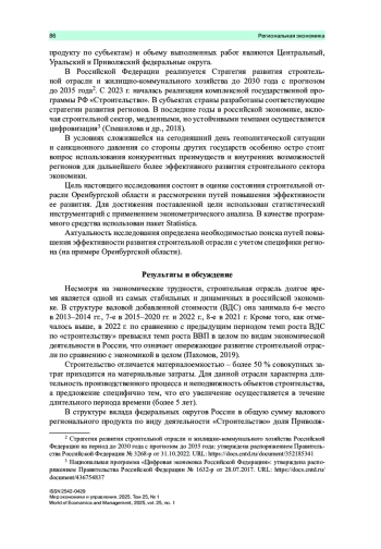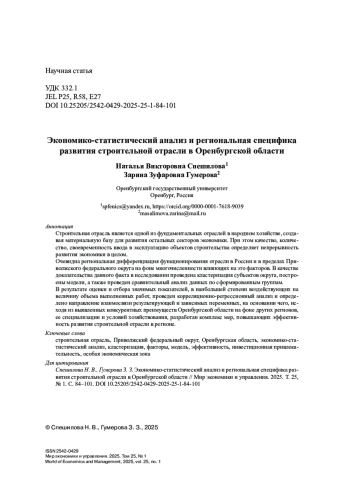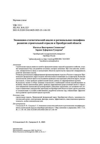 Строительная отрасль является одной из фундаментальных отраслей в народном хозяйстве, создавая материальную базу для развития остальных секторов экономики. При этом качество, количество, своевременность ввода в эксплуатацию объектов строительства определяет непрерывность развития экономики в целом. Очевидна региональная дифференциация функционирования отрасли в России и в пределах Приволжского федерального округа на фоне многочисленности влияющих на это факторов. В качестве доказательства данного факта в исследовании проведена кластеризация субъектов округа, построены модели, а также проведен сравнительный анализ данных по сформированным группам. В результате оценки и отбора значимых показателей, в наибольшей степени воздействующих на величину объема выполненных работ, проведен корреляционно-регрессионный анализ и определено направление взаимосвязи результирующей и зависимых переменных, на основании чего, исходя из выявленных конкурентных преимуществ Оренбургской области на фоне других регионов, ее специализации и условий хозяйствования, разработан комплекс мер, повышающих эффективность развития строительной отрасли в регионе.