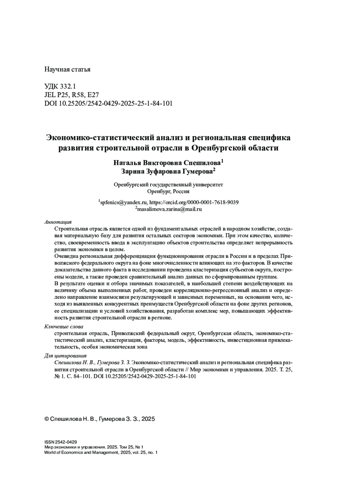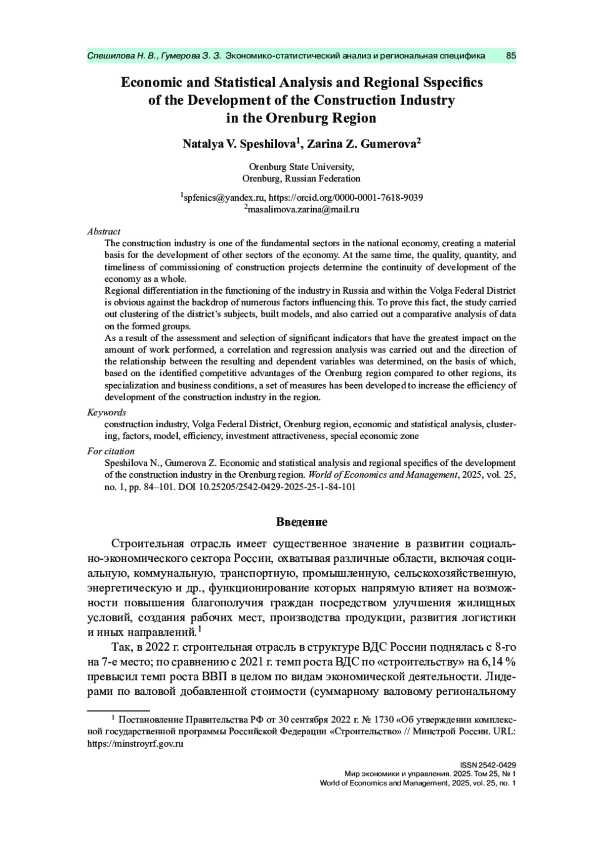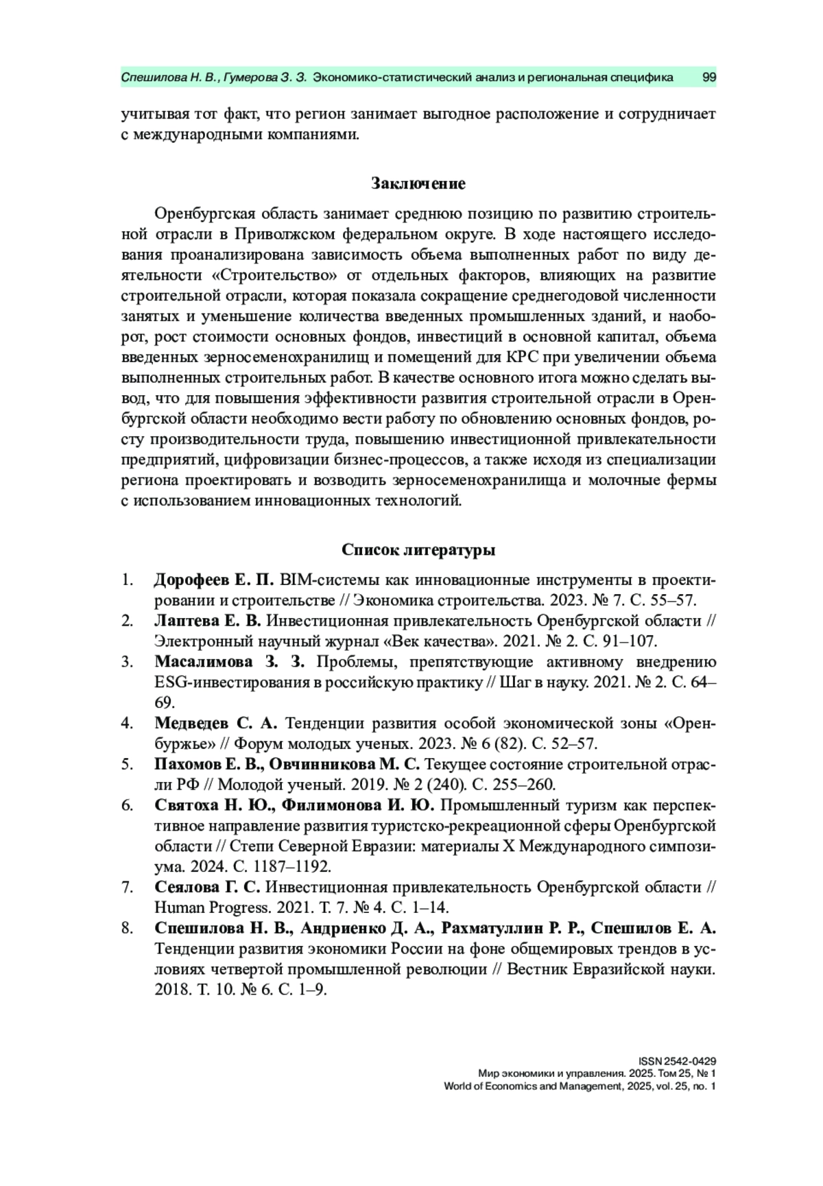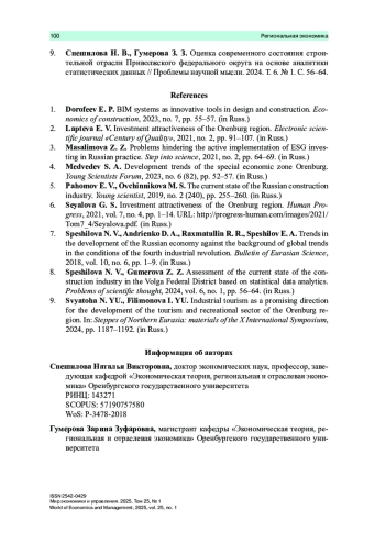 9. Спешилова Н. В., Гумерова З. З. Оценка современного состояния строительной отрасли Приволжского федерального округа на основе аналитики статистических данных // Проблемы научной мысли. 2024. Т. 6. № 1. С. 56-64.