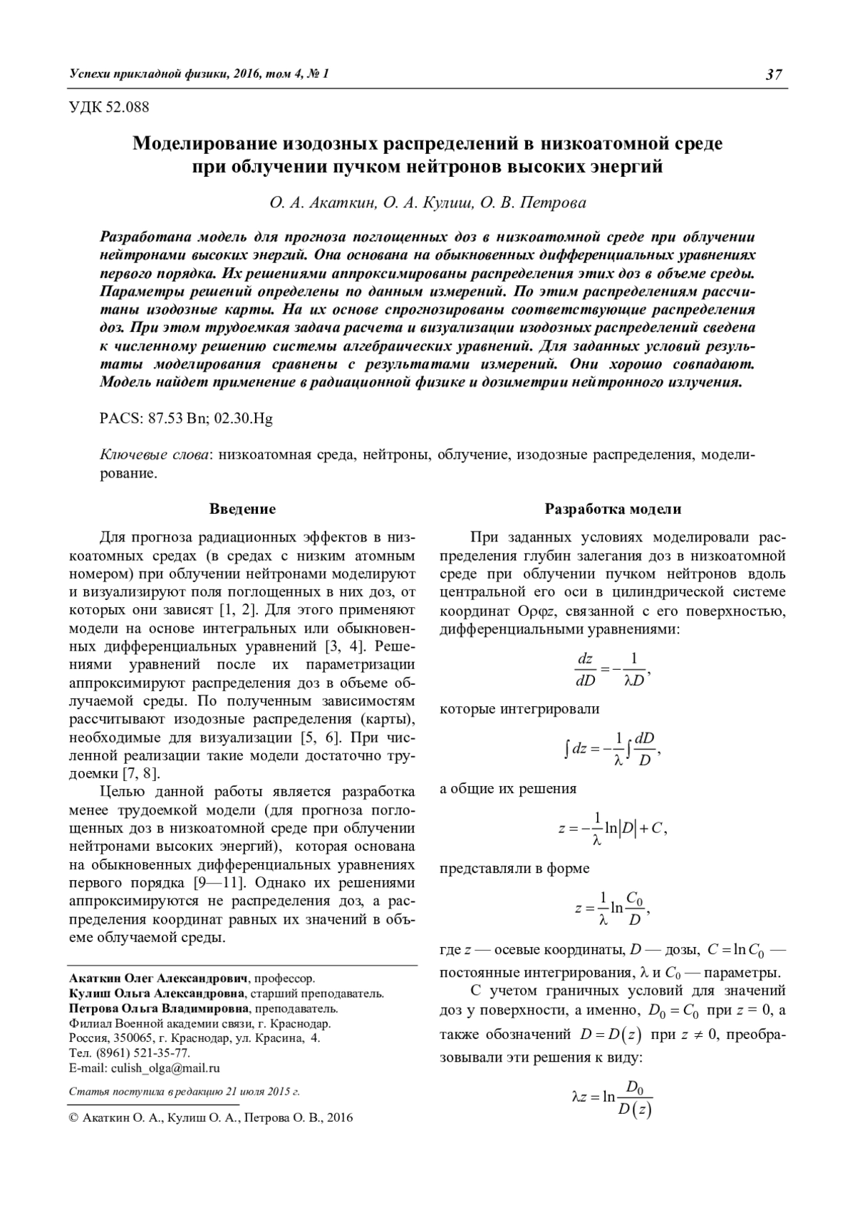 Акаткин О. А., Кулиш О. А., Петрова О. В. Моделирование изодозных распределений в низкоатомной среде при облучении пучком нейтронов высоких энергий 37
