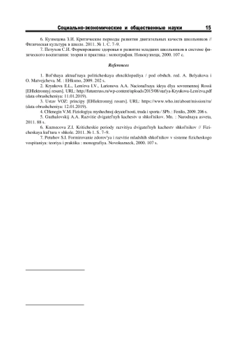 6. Кузнецова З.И. Критические периоды развития двигательных качеств школьников // Физическая культура в школе. 2011. № 1. С. 7-9.