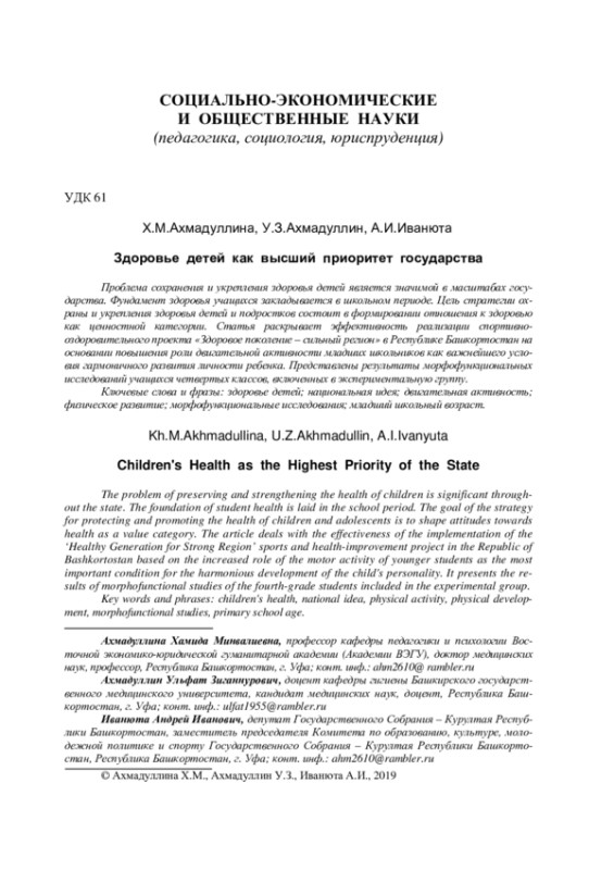 Проблема сохранения и укрепления здоровья детей является значимой в масштабах государства. Фундамент здоровья учащихся закладывается в школьном периоде. Цель стратегии охраны и укрепления здоровья детей и подростков состоит в формировании отношения к здоровью как ценностной категории. Статья раскрывает эффективность реализации спортивнооздоровительного проекта «Здоровое поколение – сильный регион» в Республике Башкортостан на основании повышения роли двигательной активности младших школьников как важнейшего условия гармоничного развития личности ребенка. Представлены результаты морфофункциональных исследований учащихся четвертых классов, включенных в экспериментальную группу