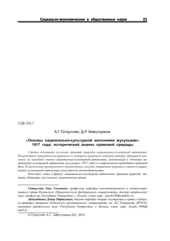 Статья посвящена изучению правовой природы национально-культурной автономии. Посредством сравнительно-правового и историко-правового методов авторы обращают внимание на правовой статус национально-культурной автономии, заложенный в «Основах национально-культурной автономии мусульман» 1917 года и в современной нормативно-правовой базе. В заключении предлагаются определенные способы повышения правового статуса национально-культурной автономии в российском законодательстве