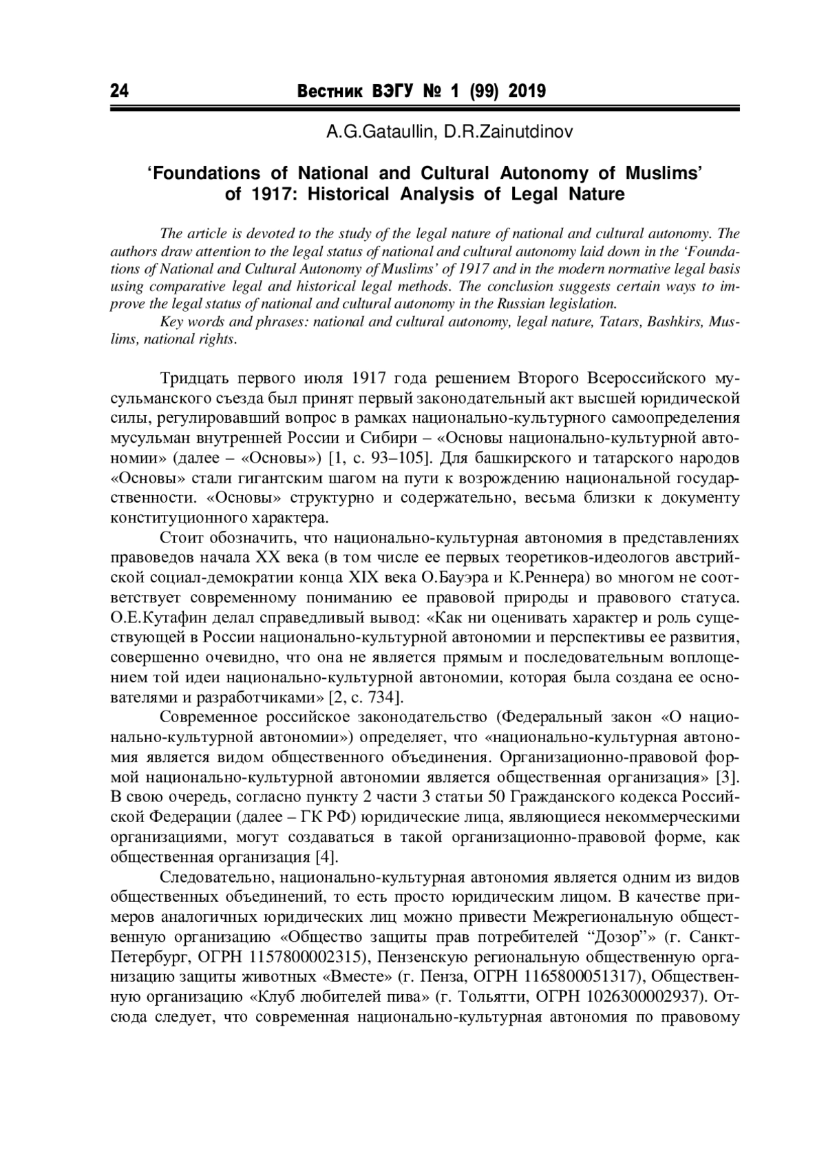 Тридцать первого июля 1917 года решением Второго Всероссийского мусульманского съезда был принят первый законодательный акт высшей юридической силы, регулировавший вопрос в рамках национально-культурного самоопределения мусульман внутренней России и Сибири – «Основы национально-культурной автономии» (далее – «Основы») [1, c. 93–105]. Для башкирского и татарского народов «Основы» стали гигантским шагом на пути к возрождению национальной государственности. «Основы» структурно и содержательно, весьма близки к документу конституционного характера