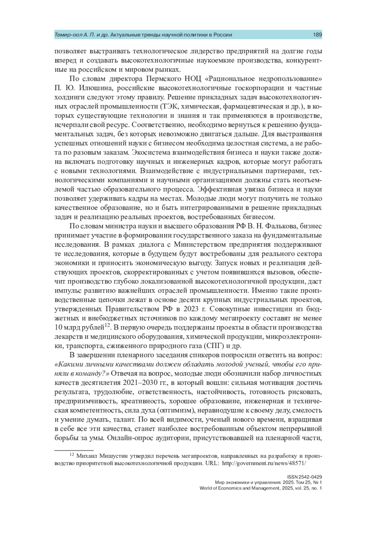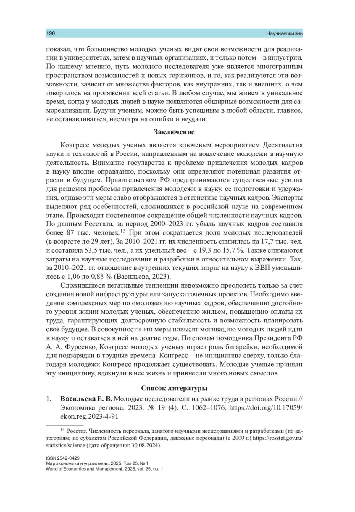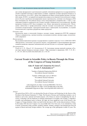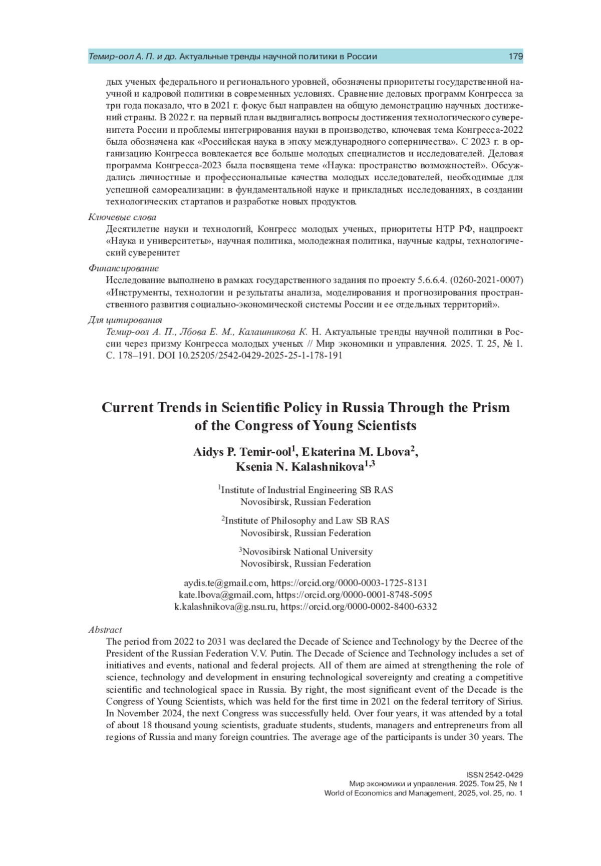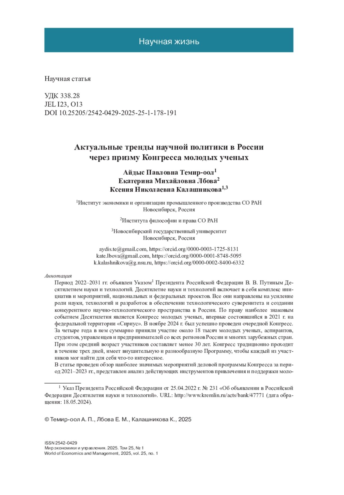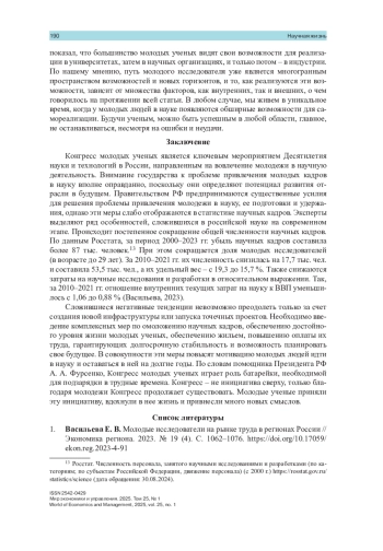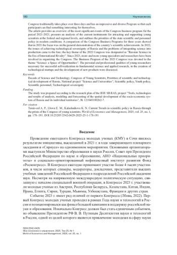 Период 2022–2031 гг. объявлен Указом1 Президента Российской Федерации В. В. Путиным Десятилетием науки и технологий. Десятилетие науки и технологий включает в себя комплекс инициатив и мероприятий, национальных и федеральных проектов. Все они направлены на усиление роли науки, технологий и разработок в обеспечении технологического суверенитета и создании конкурентного научно-технологического пространства в России. По праву наиболее знаковым событием Десятилетия является Конгресс молодых ученых, впервые состоявшийся в 2021 г. На федеральной территории «Сириус». В ноябре 2024 г. был успешно проведен очередной Конгресс. За четыре года в нем суммарно приняли участие около 18 тысяч молодых ученых, аспирантов, студентов, управленцев и предпринимателей со всех регионов России и многих зарубежных стран. При этом средний возраст участников составляет менее 30 лет. Конгресс традиционно проходит в течение трех дней, имеет внушительную и разнообразную Программу, чтобы каждый из участников мог найти для себя что-то интересное. В статье проведен обзор наиболее значимых мероприятий деловой программы Конгресса за период 2021–2023 гг., представлен анализ действующих инструментов привлечения и поддержки молодых ученых федерального и регионального уровней, обозначены приоритеты государственной научной и кадровой политики в современных условиях. Сравнение деловых программ Конгресса за три года показало, что в 2021 г. фокус был направлен на общую демонстрацию научных достижений страны. В 2022 г. на первый план выдвигались вопросы достижения технологического суверенитета России и проблемы интегрирования науки в производство, ключевая тема Конгресса-2022 была обозначена как «Российская наука в эпоху международного соперничества». С 2023 г. в организацию Конгресса вовлекается все больше молодых специалистов и исследователей. Деловая программа Конгресса-2023 была посвящена теме «Наука: пространство возможностей». Обсуждались личностные и профессиональные качества молодых исследователей, необходимые для успешной самореализации: в фундаментальной науке и прикладных исследованиях, в создании технологических стартапов и разработке новых продуктов.