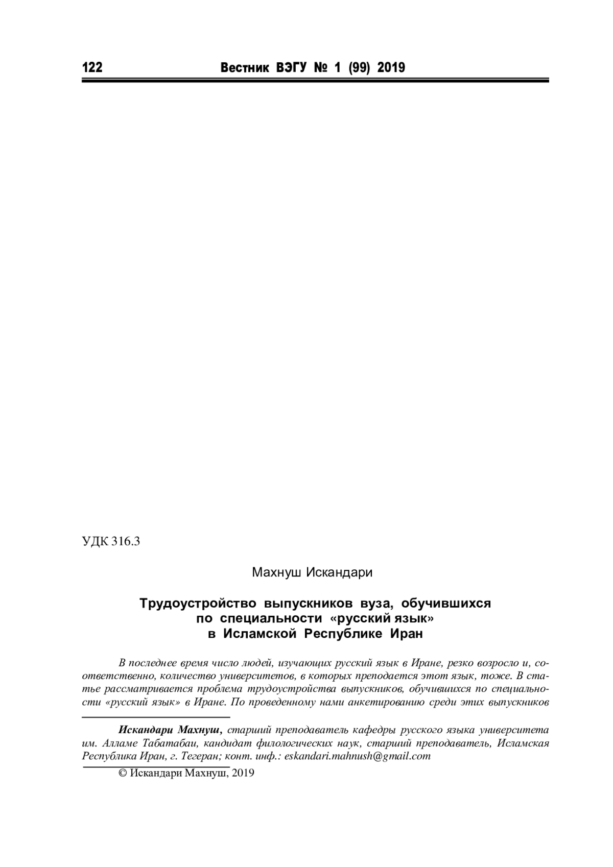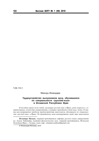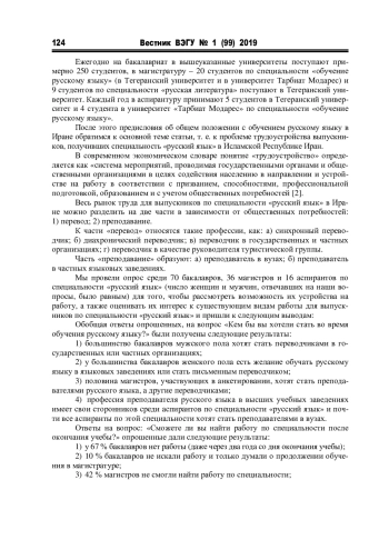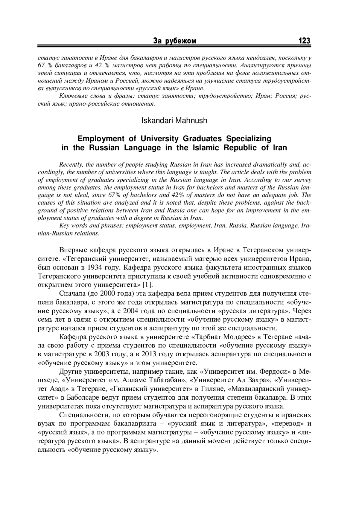 В последнее время число людей, изучающих русский язык в Иране, резко возросло и, соответственно, количество университетов, в которых преподается этот язык, тоже. В статье рассматривается проблема трудоустройства выпускников, обучившихся по специальности «русский язык» в Иране. По проведенному нами анкетированию среди этих выпускников статус занятости в Иране для бакалавров и магистров русского языка неидеален, поскольку у 67 % бакалавров и 42 % магистров нет работы по специальности. Анализируются причины этой ситуации и отмечается, что, несмотря на эти проблемы на фоне положительных отношений между Ираном и Россией, можно надеяться на улучшение статуса трудоустройства выпускников по специальности «русский язык» в Иране