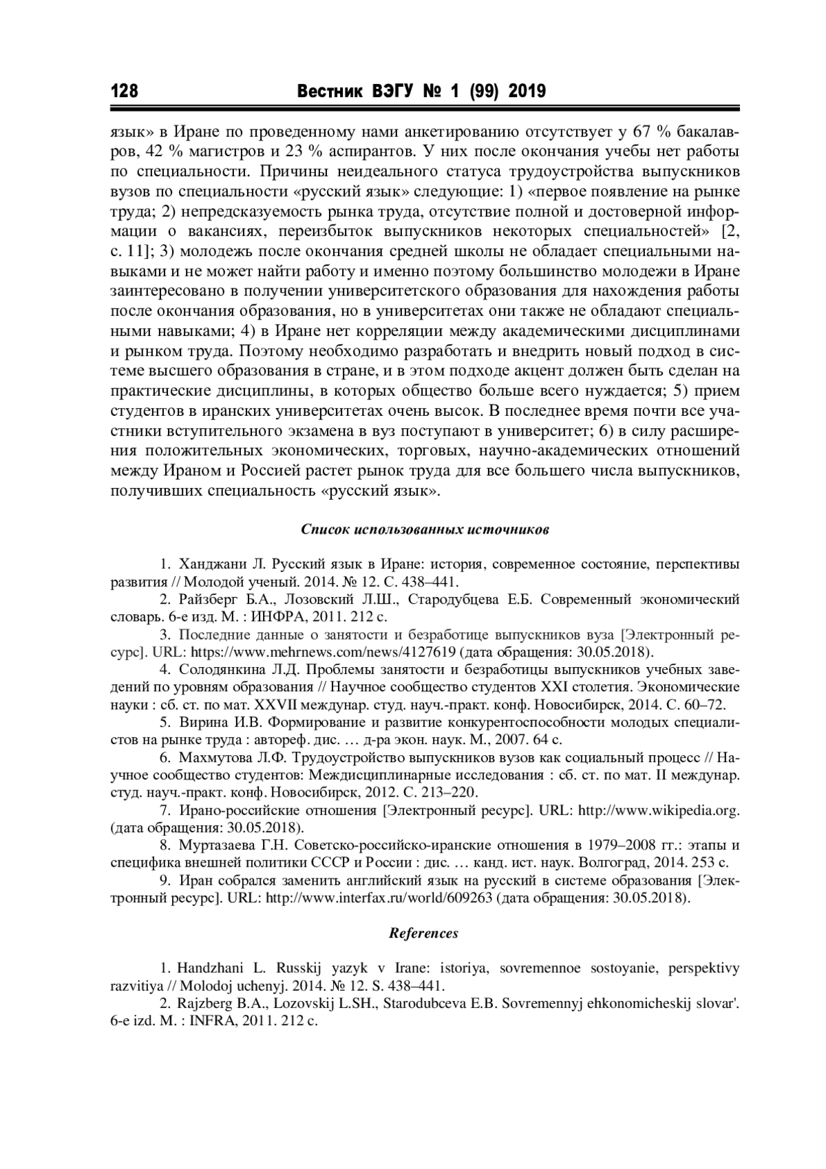 1. Ханджани Л. Русский язык в Иране: история, современное состояние, перспективы развития // Молодой ученый. 2014. № 12. С. 438-441. EDN: SJAKNT