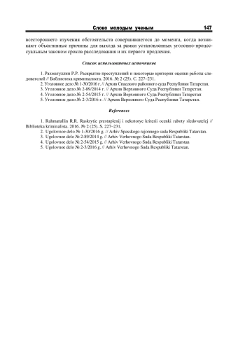 1. Рахматуллин Р.Р. Раскрытие преступлений и некоторые критерии оценки работы следователей // Библиотека криминалиста. 2016. № 2 (25). С. 227-231. EDN: VOWBZL