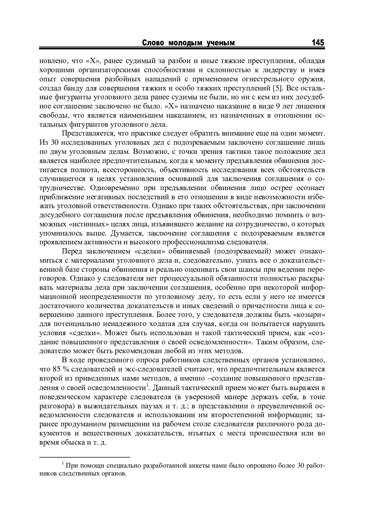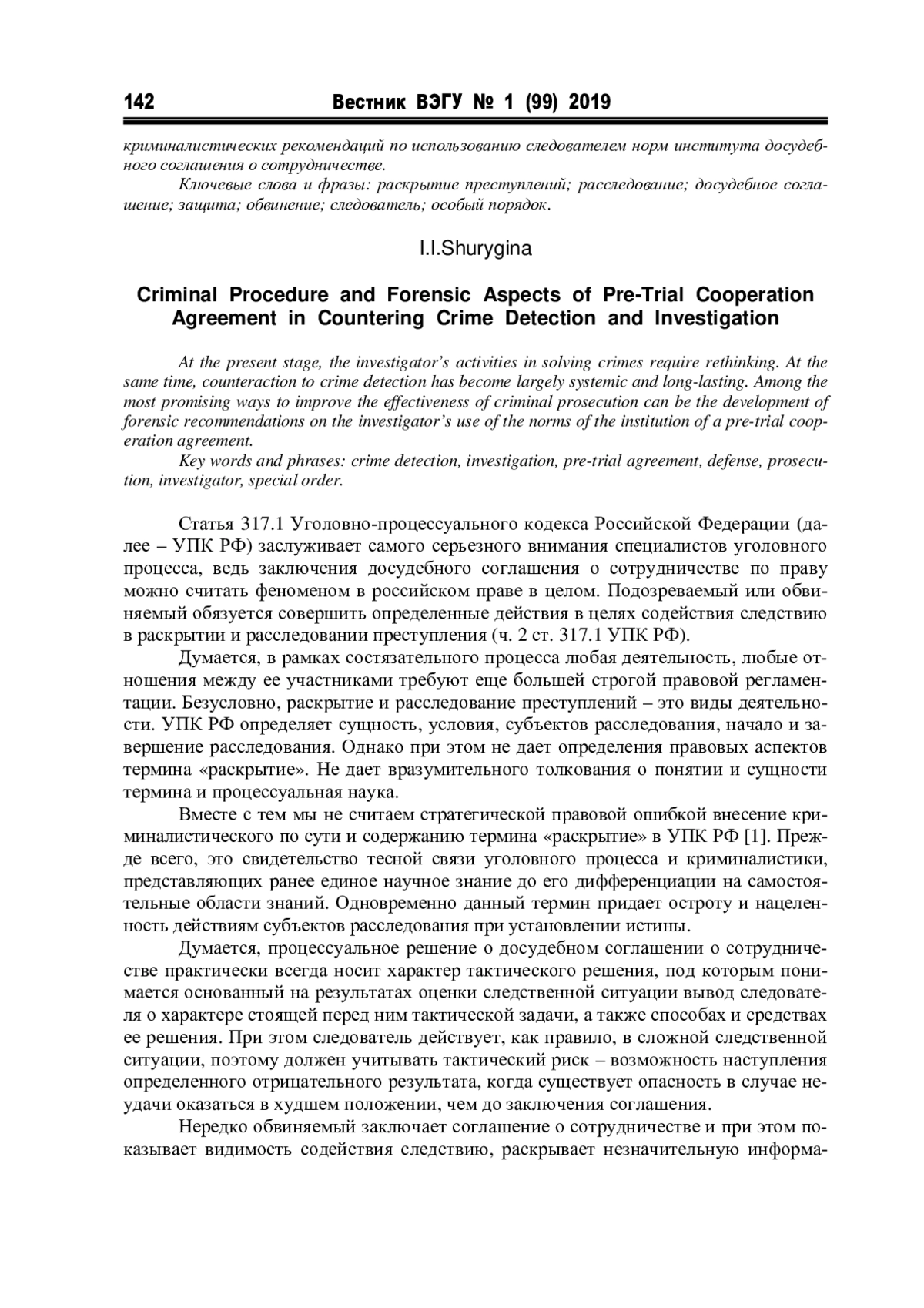 Статья 317.1 Уголовно-процессуального кодекса Российской Федерации (далее – УПК РФ) заслуживает самого серьезного внимания специалистов уголовного процесса, ведь заключения досудебного соглашения о сотрудничестве по праву можно считать феноменом в российском праве в целом. Подозреваемый или обвиняемый обязуется совершить определенные действия в целях содействия следствию в раскрытии и расследовании преступления (ч. 2 ст. 317.1 УПК РФ).