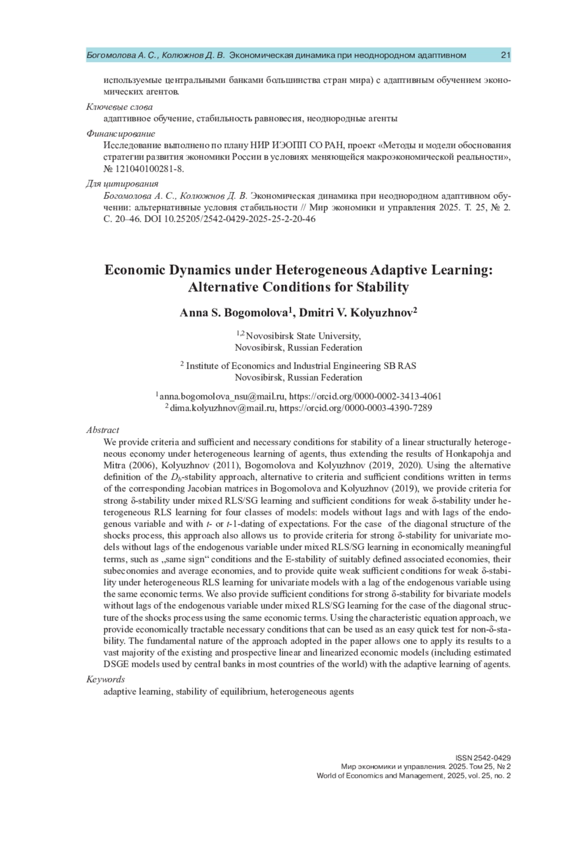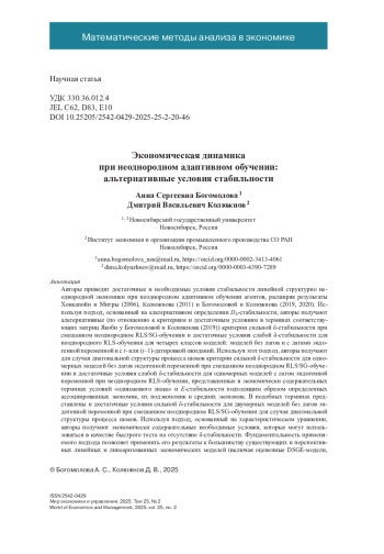 Авторы приводят достаточные и необходимые условия стабильности линейной структурно неоднородной экономики при неоднородном адаптивном обучении агентов, расширяя результаты Хонкапойи и Митры (2006), Колюжнова (2011) и Богомоловой и Колюжнова (2019, 2020). Используя подход, основанный на альтернативном определении Db-стабильности, авторы получают альтернативные (по отношению к критериям и достаточным условиям в терминах соответствующих матриц Якоби у Богомоловой и Колюжнова (2019)) критерии сильной δ-стабильности при смешанном неоднородном RLS/SG-обучении и достаточные условия слабой δ-стабильности для неоднородного RLS-обучения для четырех классов моделей: моделей без лагов и с лагами эндогенной переменной и с t- или (t–1)-датировкой ожиданий. Используя этот подход, авторы получают для случая диагональной структуры процесса шоков критерии сильной δ-стабильности для одномерных моделей без лагов эндогенной переменной при смешанном неоднородном RLS/SG-обучении и достаточные условия слабой δ-стабильности для одномерных моделей с лагом эндогенной переменной при неоднородном RLS-обучении, представленные в экономически содержательных терминах условий «одинакового знака» и E-стабильности подходящим образом определенных ассоциированных экономик, их подэкономик и средних экономик. В подобных терминах представлены и достаточные условия сильной δ-стабильности для двумерных моделей без лагов эндогенной переменной при смешанном неоднородном RLS/SG-обучении для случая диагональной структуры процесса шоков. Используя подход, основанный на характеристическом уравнении, авторы получают экономически содержательные необходимые условия, которые могут использоваться в качестве быстрого теста на отсутствие δ-стабильности. Фундаментальность применяемого подхода позволяет применить его результаты к большинству существующих и перспективных линейных и линеаризованных экономических моделей (включая оцененные DSGE-модели, используемые центральными банками большинства стран мира) с адаптивным обучением экономических агентов.