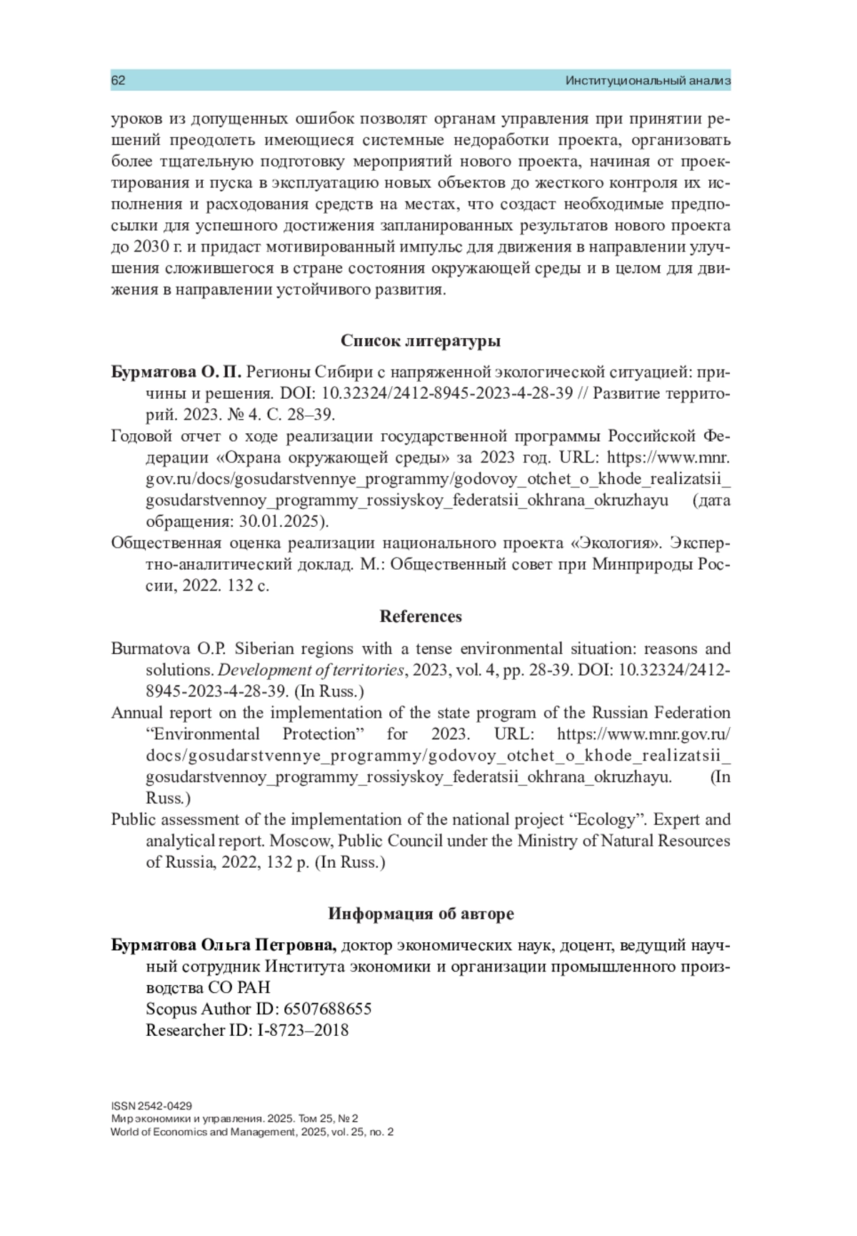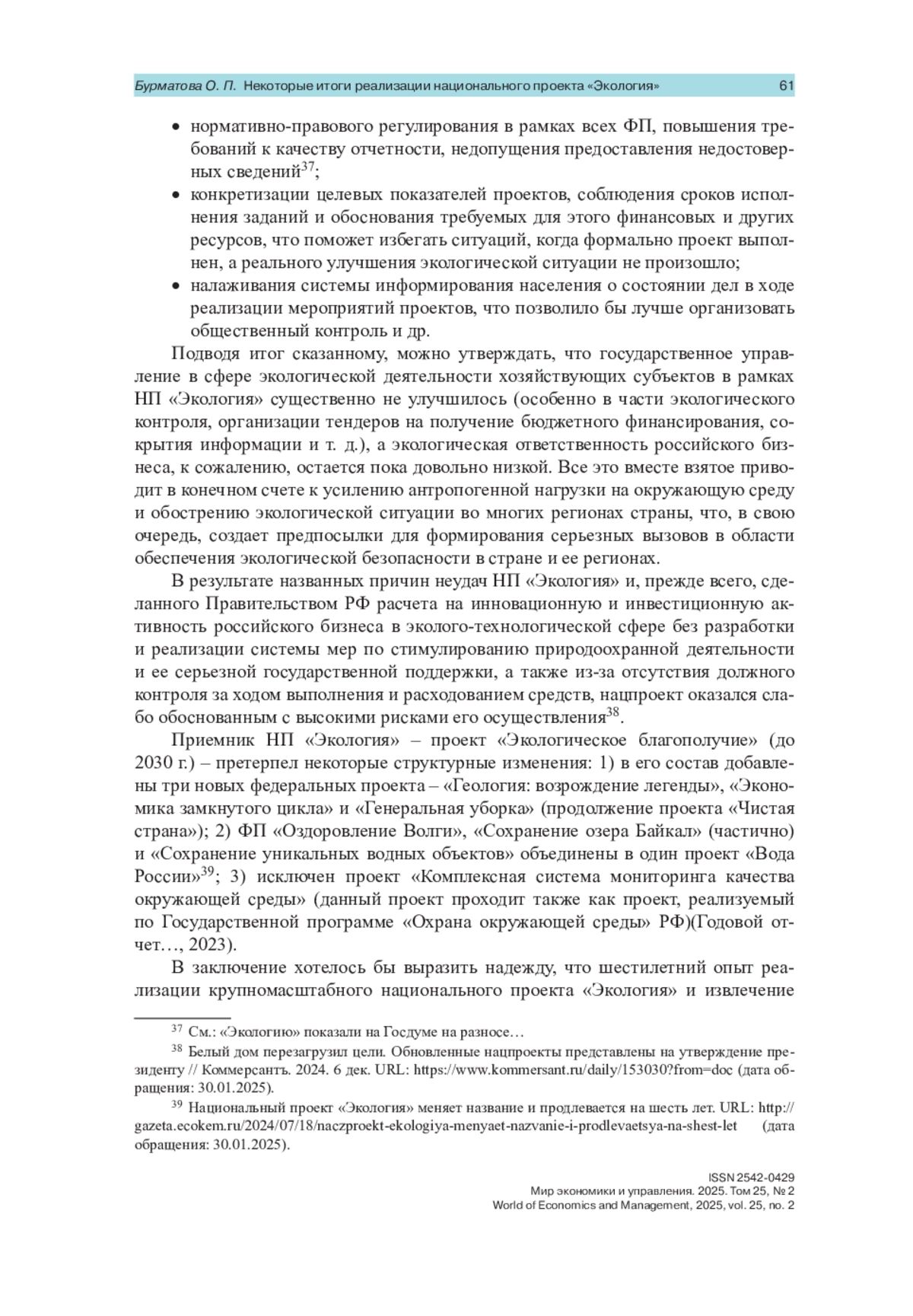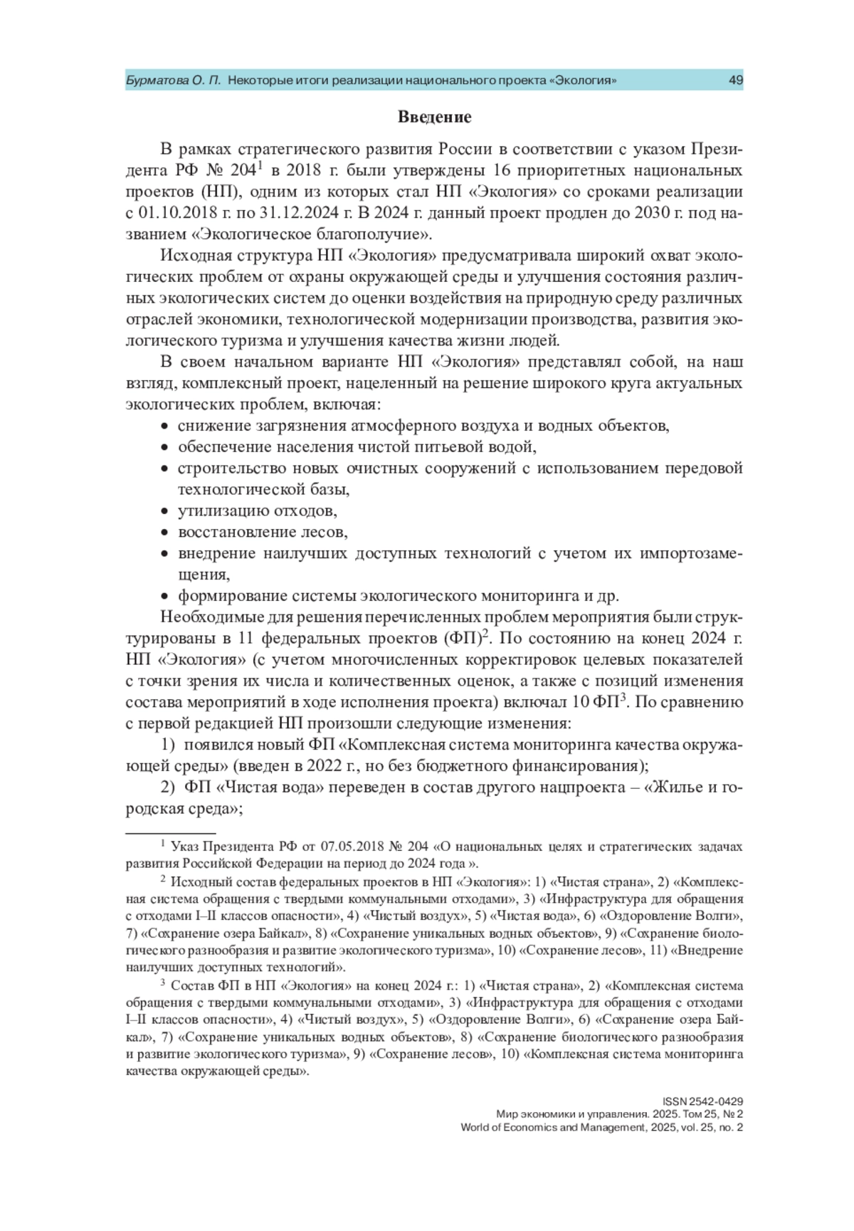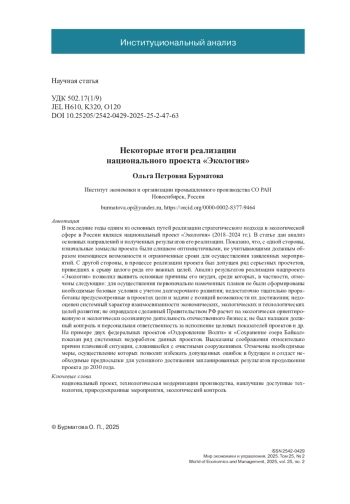 В последние годы одним из основных путей реализации стратегического подхода в экологической сфере в России являлся национальный проект «Экология» (2018–2024 гг.). В статье дан анализ основных направлений и полученных результатов его реализации. Показано, что, с одной стороны, изначальные замыслы проекта были слишком оптимистичными, не учитывающими должным образом имеющиеся возможности и ограниченные сроки для осуществления заявленных мероприятий. С другой стороны, в процессе реализации проекта был допущен ряд серьезных просчетов, приведших к срыву целого ряда его важных целей. Анализ результатов реализации нацпроекта «Экология» позволил выявить основные причины его неудач, среди которых, в частности, отмечены следующие: для осуществления первоначально намеченных планов не были сформированы необходимые базовые условия с учетом долгосрочного развития; недостаточно тщательно проработаны предусмотренные в проектах цели и задачи с позиций возможности их достижения; недооценен системный характер взаимосвязанности экономических, экологических и технологических целей развития; не оправдался сделанный Правительством РФ расчет на экологически ориентированную и экологически осознанную деятельность отечественного бизнеса; не был налажен должный контроль и персональная ответственность за исполнение целевых показателей проектов и др. На примере двух федеральных проектов «Оздоровление Волги» и «Сохранение озера Байкал» показан ряд системных недоработок данных проектов. Высказаны соображения относительно причин плачевной ситуации, сложившейся с очистными сооружениями. Отмечены необходимые меры, осуществление которых позволит избежать допущенных ошибок в будущем и создаст необходимые предпосылки для успешного достижения запланированных результатов продолжения проекта до 2030 года.
