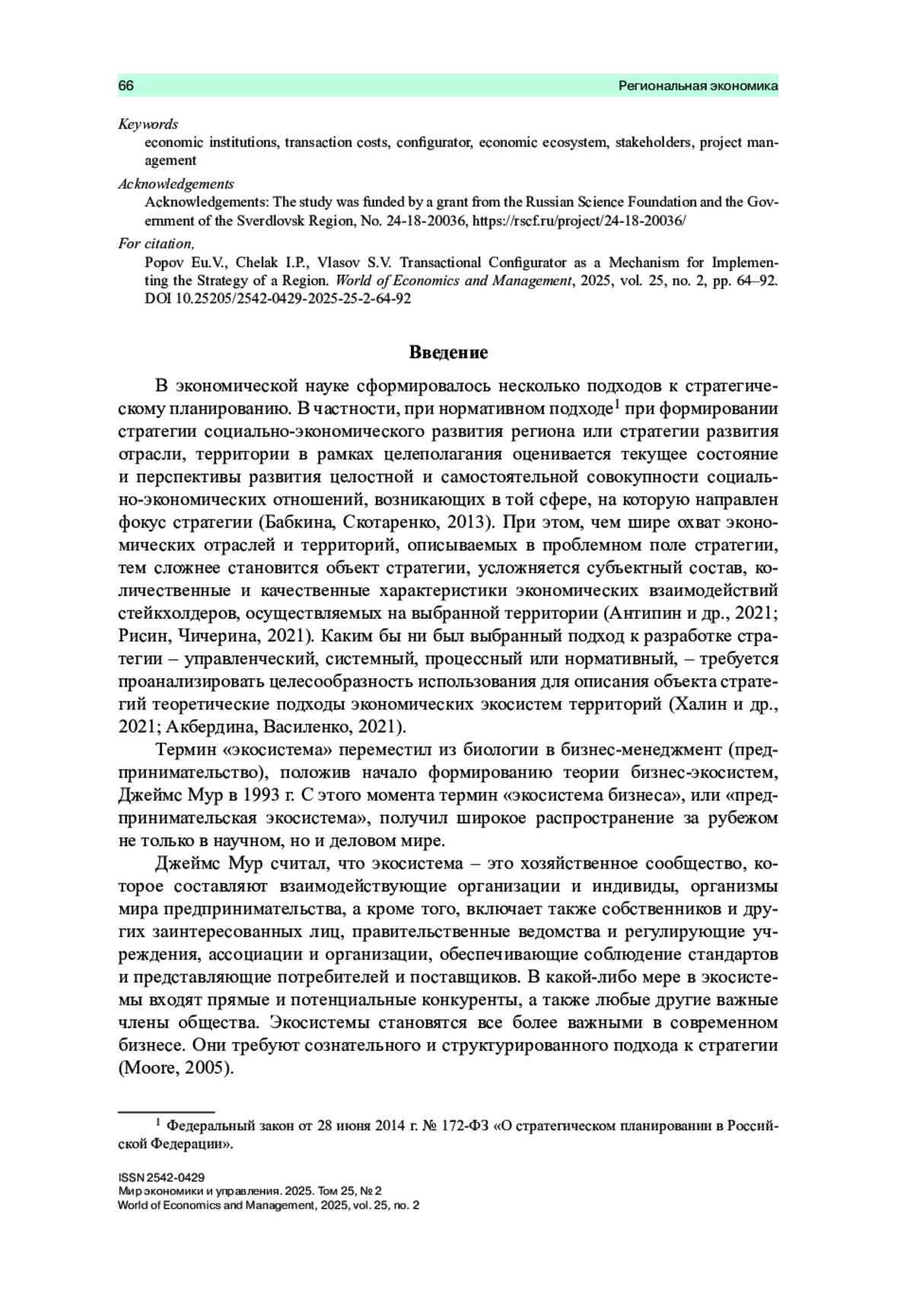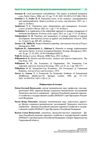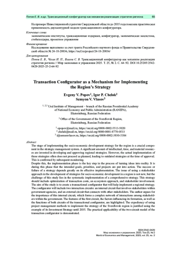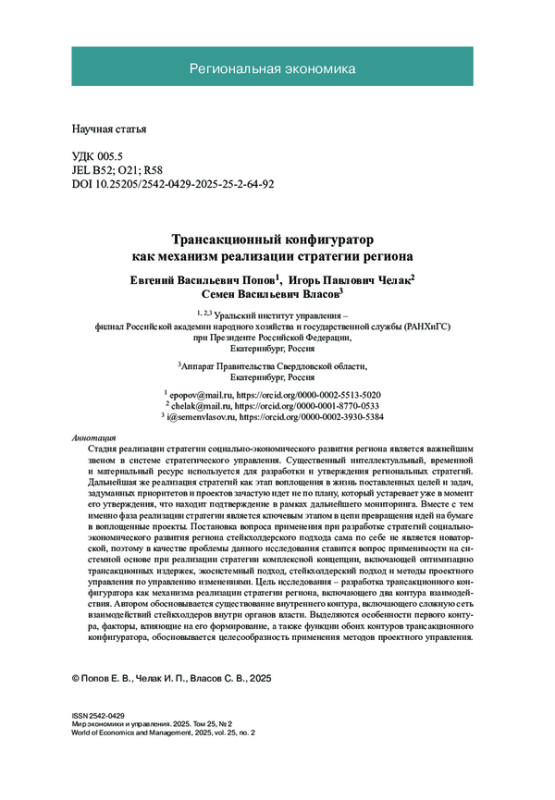 Стадия реализации стратегии социально-экономического развития региона является важнейшим звеном в системе стратегического управления. Существенный интеллектуальный, временной и материальный ресурс используется для разработки и утверждения региональных стратегий. Дальнейшая же реализация стратегий как этап воплощения в жизнь поставленных целей и задач, задуманных приоритетов и проектов зачастую идет не по плану, который устаревает уже в момент его утверждения, что находит подтверждение в рамках дальнейшего мониторинга. Вместе с тем именно фаза реализации стратегии является ключевым этапом в цепи превращения идей на бумаге в воплощенные проекты. Постановка вопроса применения при разработке стратегий социально-экономического развития региона стейкхолдерского подхода сама по себе не является новаторской, поэтому в качестве проблемы данного исследования ставится вопрос применимости на системной основе при реализации стратегии комплексной концепции, включающей оптимизацию трансакционных издержек, экосистемный подход, стейкхолдерский подход и методы проектного управления по управлению изменениями. Цель исследования – разработка трансакционного конфигуратора как механизма реализации стратегии региона, включающего два контура взаимодействия. Автором обосновывается существование внутреннего контура, включающего сложную сеть взаимодействий стейкхолдеров внутри органов власти. Выделяются особенности первого контура, факторы, влияющие на его формирование, а также функции обоих контуров трансакционного конфигуратора, обосновывается целесообразность применения методов проектного управления. На примере Инвестиционной стратегии Свердловской области до 2035 года показана практическая применимость двухконтурной модели трансакционного конфигуратора.