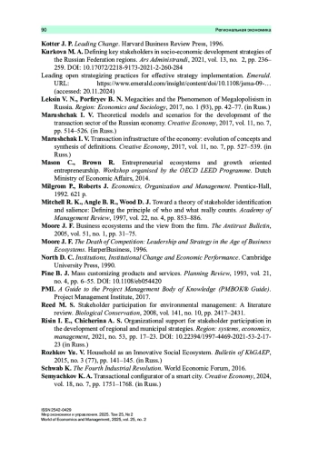 8. Куркова М. А. Определение ключевых стейкхолдеров стратегий социально-экономического развития субъектов Российской Федерации. // Ars Administrandi (Искусство управления). 2021. Т. 13, № 2. С. 236-259. https://doi.org/10.17072/22189173-2021-2236-259.