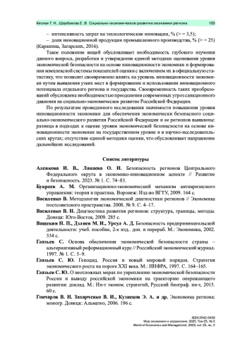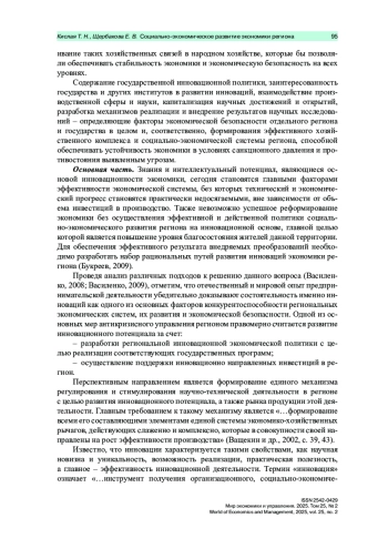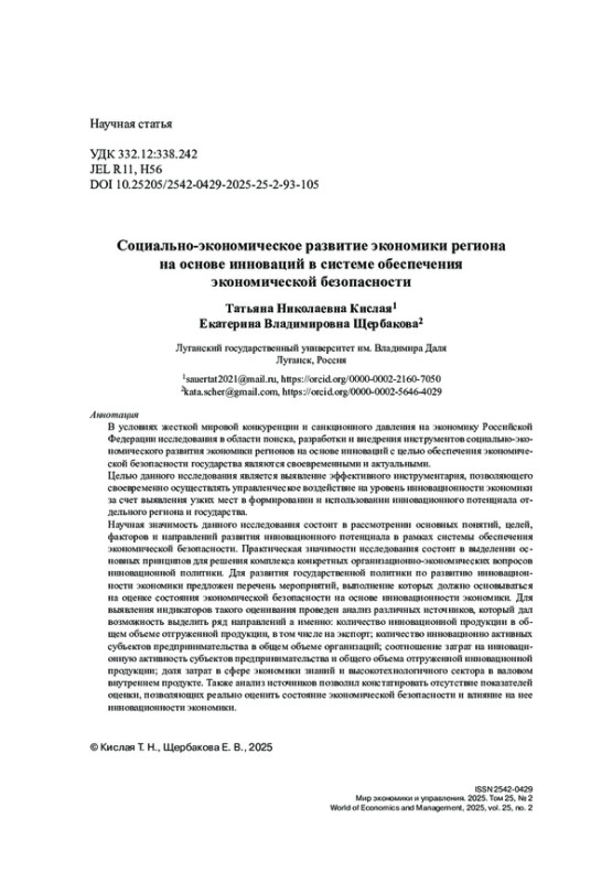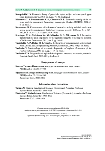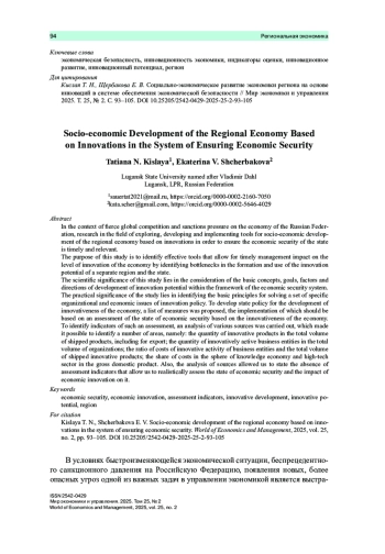 В условиях жесткой мировой конкуренции и санкционного давления на экономику Российской Федерации исследования в области поиска, разработки и внедрения инструментов социально-экономического развития экономики регионов на основе инноваций с целью обеспечения экономической безопасности государства являются своевременными и актуальными.