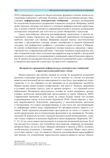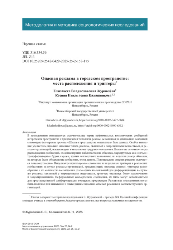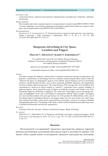 В исследовании описываются отличительные черты неформальных коммерческих сообщений в городском пространстве и предлагается типология реклам, основанная на специально созданной с помощью фотоархива проекта «Школа в пространстве мегаполиса» базе данных. Особое внимание уделяется социально опасным типам, рекламе, связанной с запрещенными веществами, и рекламе организаций, вовлекающих в незаконные трудовые отношения. Выявлены основные места расположения сообщений, их концентрация наблюдается на объектах, маркируемых как «ничьи»: трансформаторные будки, гаражи, здания неизвестного назначения, но в целом спектр объектов, на которых были обнаружены сообщения, очень широк. Потенциально опасная реклама отличается повсеместностью. Выделяются используемые словесные и визуальные триггеры в рекламных сообщениях: в случае рекламы организаций, предлагающих «помощь людям», триггеры разнообразны и их количество в сообщении стало одним из оснований для дифференциации; в случае же рекламы, связанной с запрещенными веществами, триггеры оказались более лаконичными и завуалированными. Неформальные коммерческие сообщения, их типы могут использоваться для пространственной дифференциации городских пространств. Результаты исследования могут быть полезны для выявления и ликвидации социально опасной рекламы и соответствующих организаций.