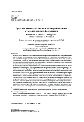 В статье представлены результаты исследования сообществ жителей аварийных домов, которые не имеют доступа ко многим современным жилищным благам, и практик их взаимодействия. Наличие аварийного статуса дома связано с проблемой жилищного неравенства, поскольку оказывает значительное влияние на качество жизни, что позволяет рассматривать данный феномен в рамках концепции жилищной депривации, охватывающей как проблемы проживания, так и социальные и психологические последствия для индивидов.