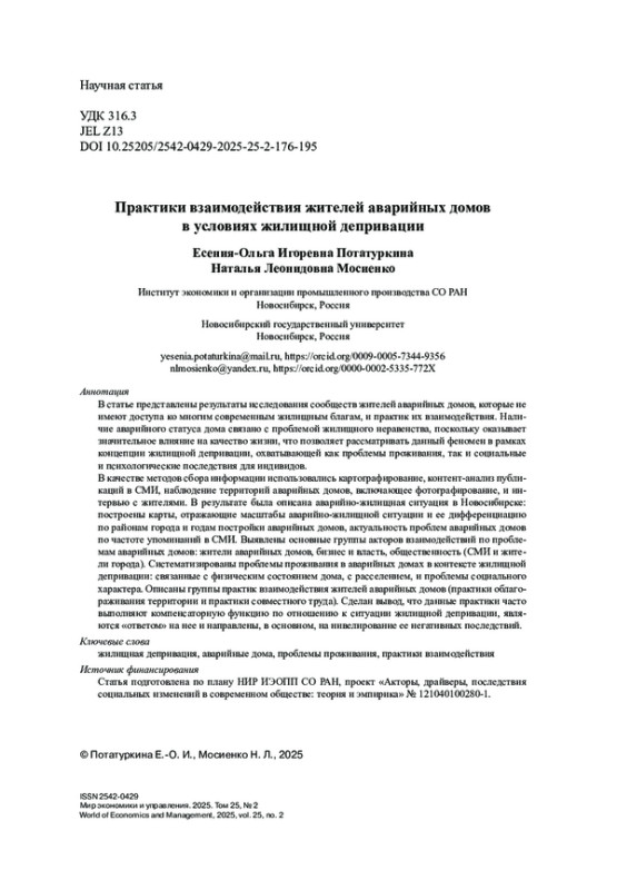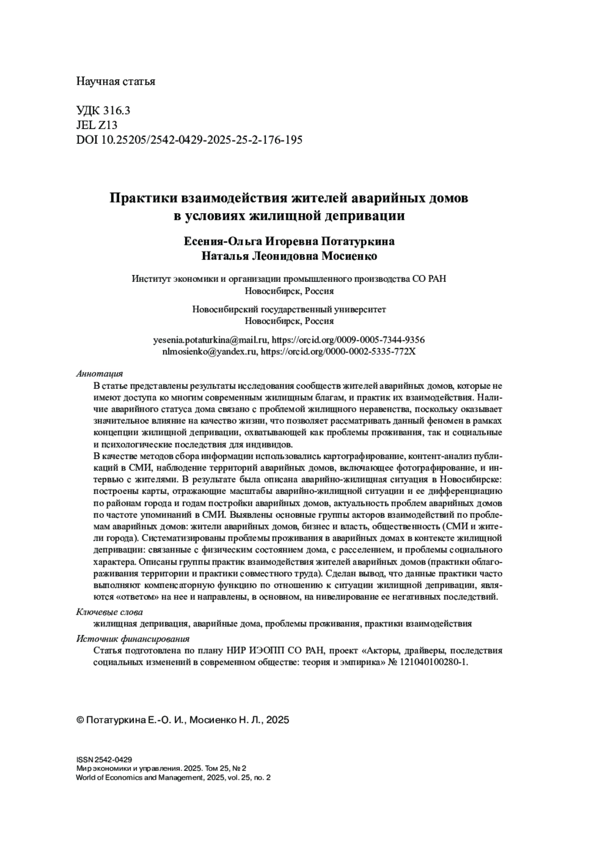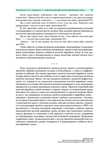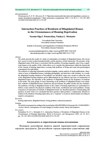 В качестве методов сбора информации использовались картографирование, контент-анализ публикаций в СМИ, наблюдение территорий аварийных домов, включающее фотографирование, и интервью с жителями. В результате была описана аварийно-жилищная ситуация в Новосибирске: построены карты, отражающие масштабы аварийно-жилищной ситуации и ее дифференциацию по районам города и годам постройки аварийных домов, актуальность проблем аварийных домов по частоте упоминаний в СМИ. Выявлены основные группы акторов взаимодействий по проблемам аварийных домов: жители аварийных домов, бизнес и власть, общественность (СМИ и жители города). Систематизированы проблемы проживания в аварийных домах в контексте жилищной депривации: связанные с физическим состоянием дома, с расселением, и проблемы социального характера. Описаны группы практик взаимодействия жителей аварийных домов (практики облагораживания территории и практики совместного труда). Сделан вывод, что данные практики часто выполняют компенсаторную функцию по отношению к ситуации жилищной депривации, являются «ответом» на нее и направлены, в основном, на нивелирование ее негативных последствий.