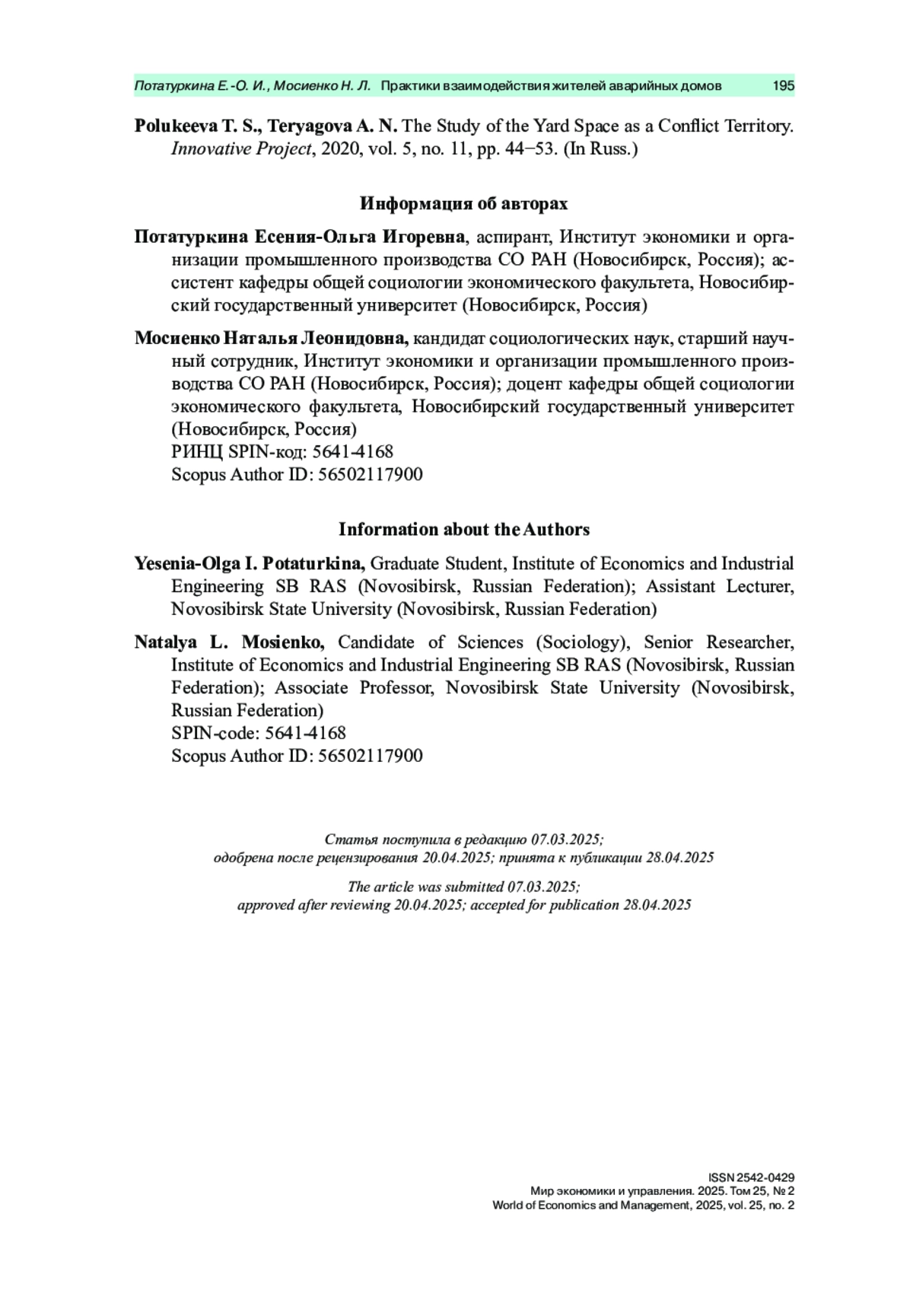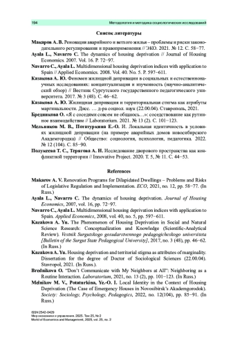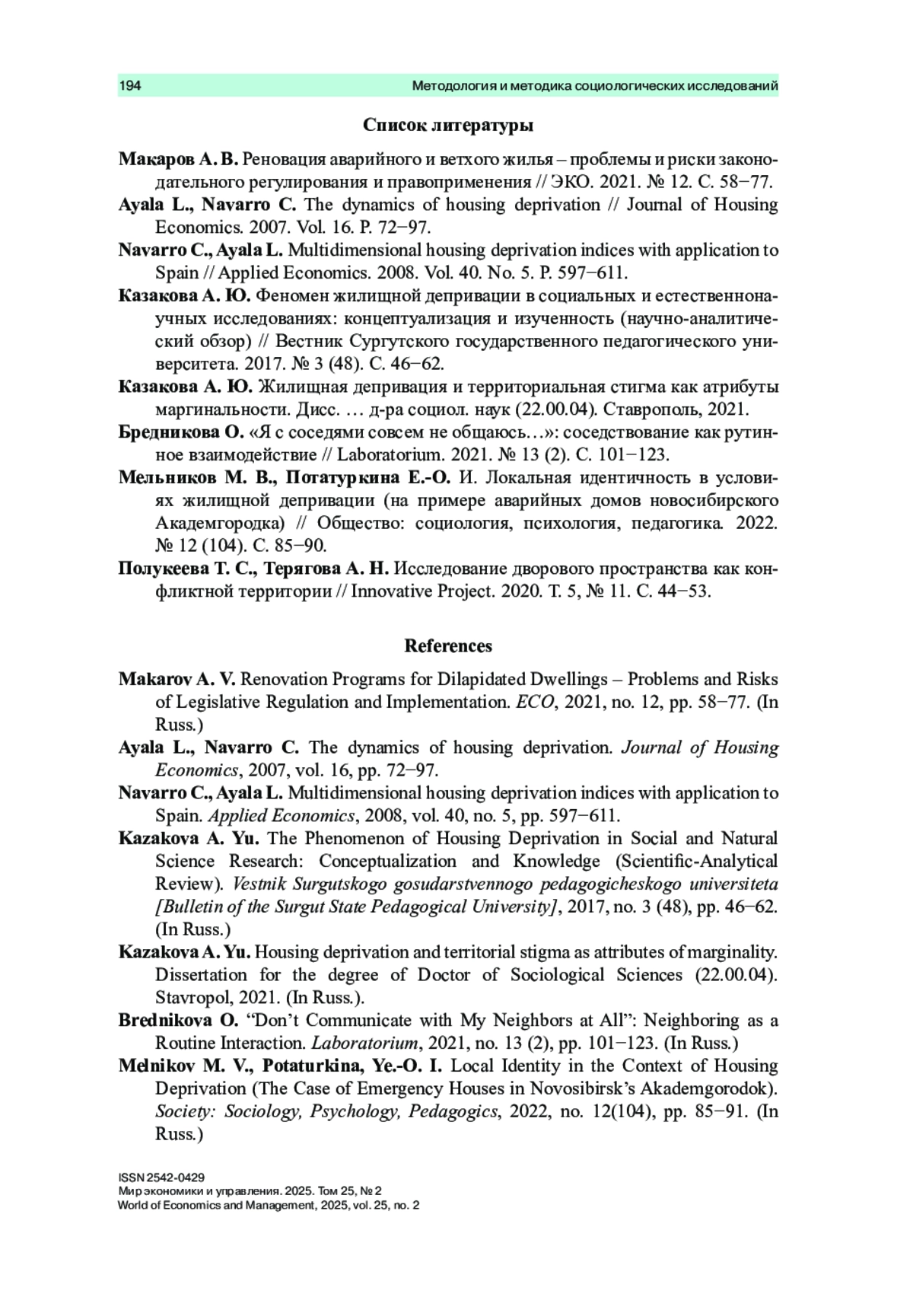 7. Мельников М. В., Потатуркина Е.-О. И. Локальная идентичность в условиях жилищной депривации (на примере аварийных домов новосибирского Академгородка) // Общество: социология, психология, педагогика. 2022. № 12 (104). С. 85−90.