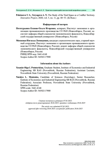8. Полукеева Т. С., Терягова А. Н. Исследование дворового пространства как конфликтной территории // Innovative Project. 2020. Т. 5, № 11. С. 44−53.