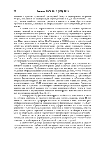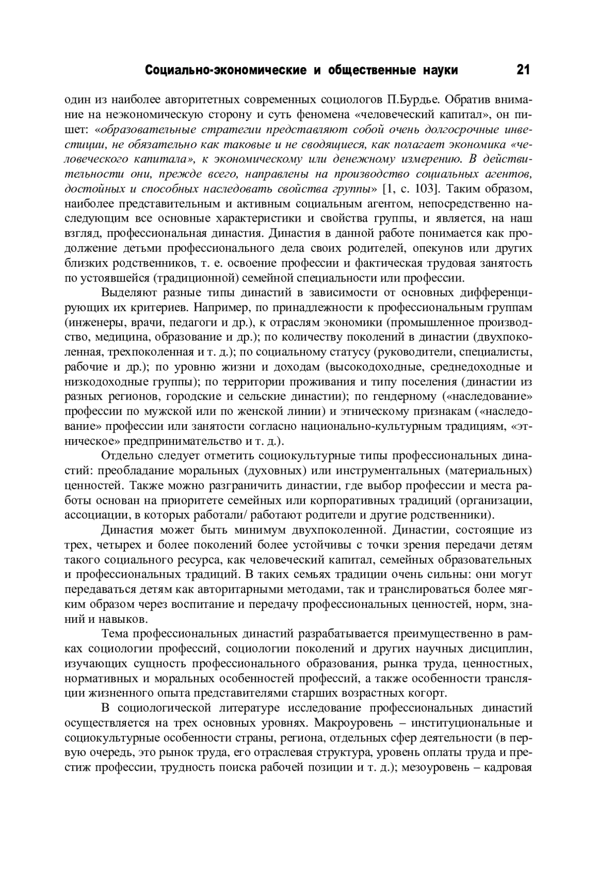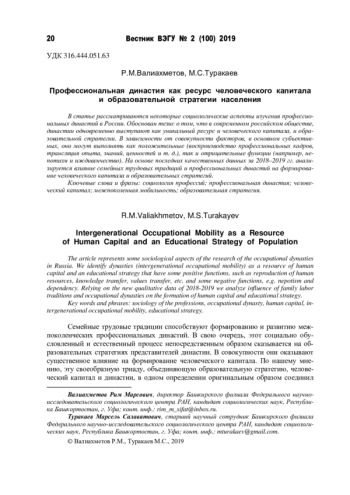 В статье рассматриваются некоторые социологические аспекты изучения профессиональных династий в России. Обоснован тезис о том, что в современном российском обществе, династии одновременно выступают как уникальный ресурс и человеческого капитала, и образовательной стратегии. В зависимости от совокупности факторов, в основном субъективных, они могут выполнять как положительные (воспроизводство профессиональных кадров, трансляция опыта, знаний, ценностей и т. д.), так и отрицательные функции (например, непотизм и иждивенчество). На основе последних качественных данных за 2018–2019 гг. анализируется влияние семейных трудовых традиций и профессиональных династий на формирование человеческого капитала и образовательных стратегий
