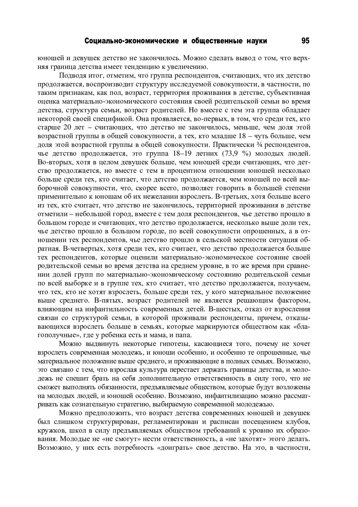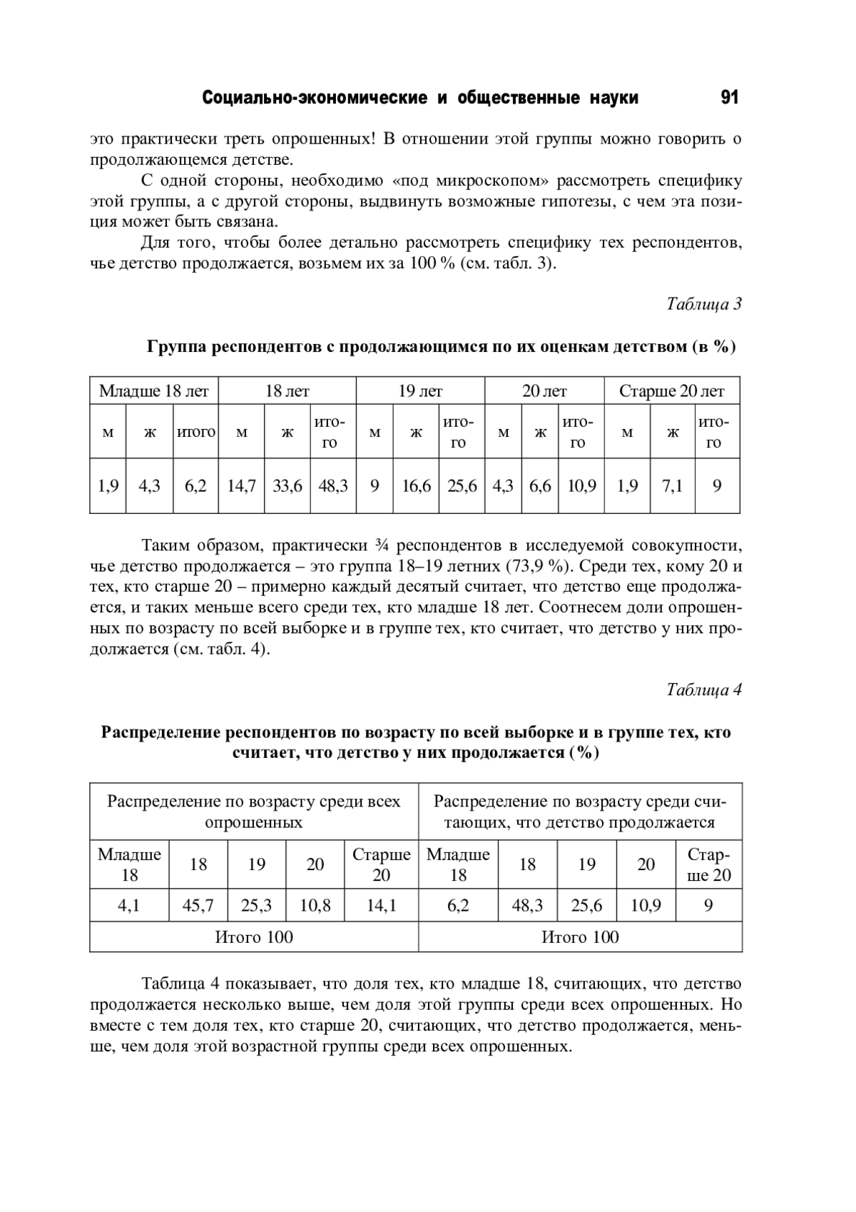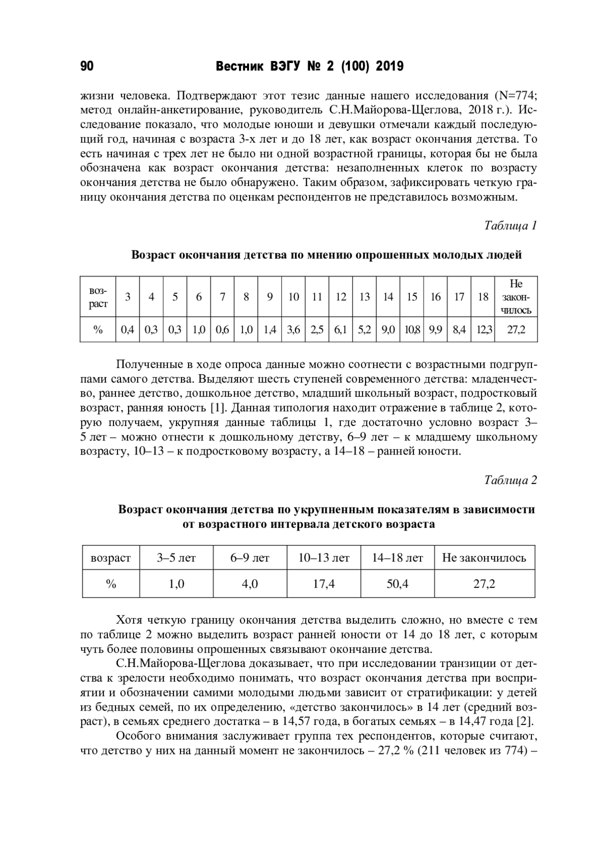 Детство отличается постоянной ориентацией на взрослый мир. События жизни ребенка закладывают фундамент развития его личности, оказывают серьезное влияние на дальнейшую жизнь. Процессы, происходящие в современном обществе, свидетельствуют о размывании границ, отделяющих детство от других периодов жизни человека. Подтверждают этот тезис данные нашего исследования (N=774; метод онлайн-анкетирование, руководитель С. Н. Майорова-Щеглова, 2018 г.). Исследование показало, что молодые юноши и девушки отмечали каждый последующий год, начиная с возраста 3-х лет и до 18 лет, как возраст окончания детства. То есть начиная с трех лет не было ни одной возрастной границы, которая бы не была обозначена как возраст окончания детства: незаполненных клеток по возрасту окончания детства не было обнаружено. Таким образом, зафиксировать четкую границу окончания детства по оценкам респондентов не представилось возможным