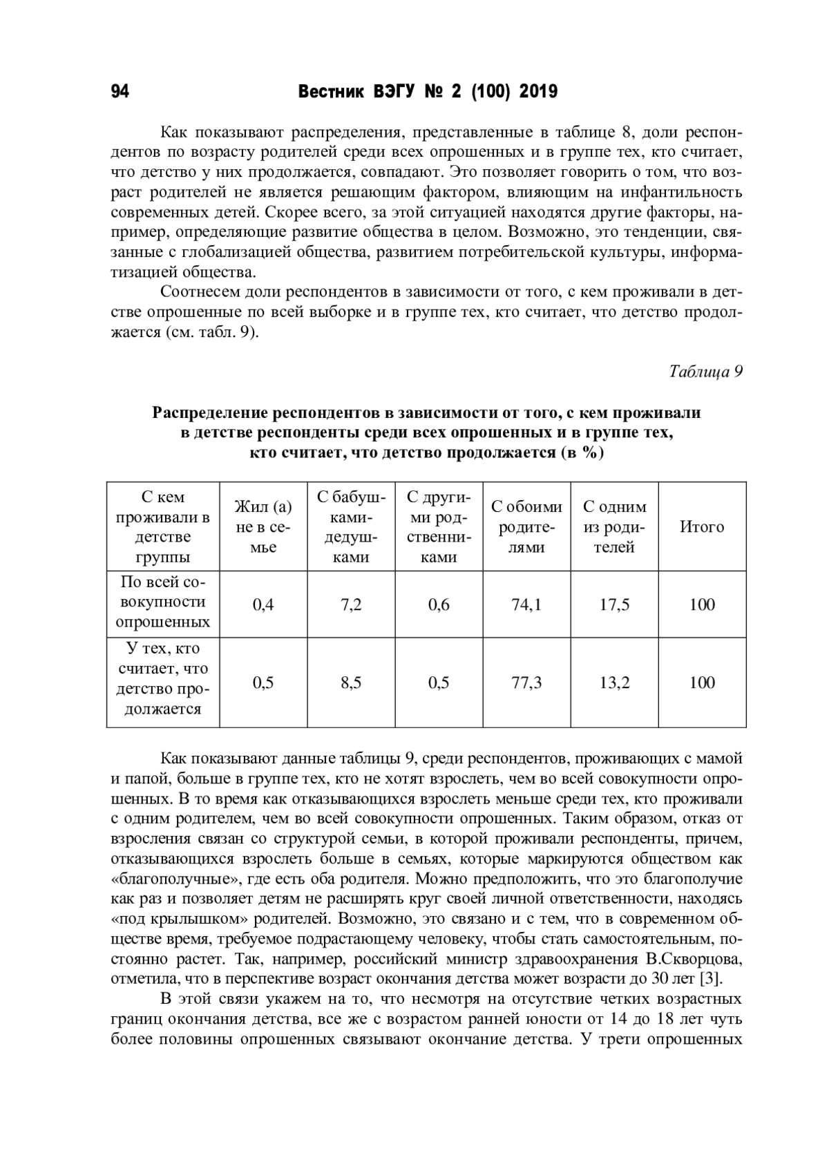 В статье на основе материалов исследования «Событийность детства поколения Z» обсуждается вопрос возрастных границ окончания современного детства. Доказывается, что окончание детства зависит от гендера, возраста, субъективной оценки материальноэкономического положения семьи, структуры семьи и территории проживания в детстве