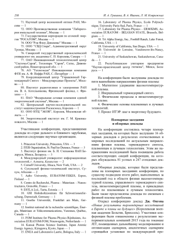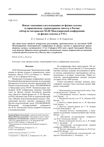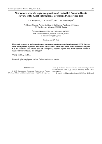 I. A. Grishina, V. A. Ivanov, and L. M. Kovrizhnych New research trends in plasma physics and controlled fusion in Russia (Review of the XLIII International Zvenigorod Conference 2015) 228